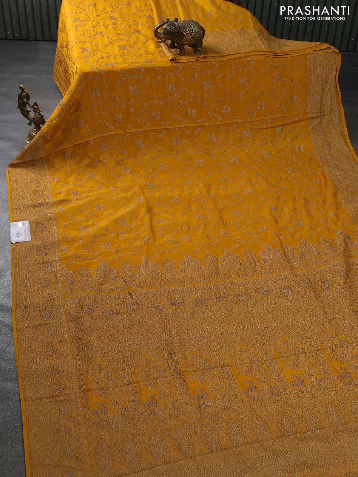 Banarasi crepe saree mustard yellow with allover thread & zari weaves and woven border