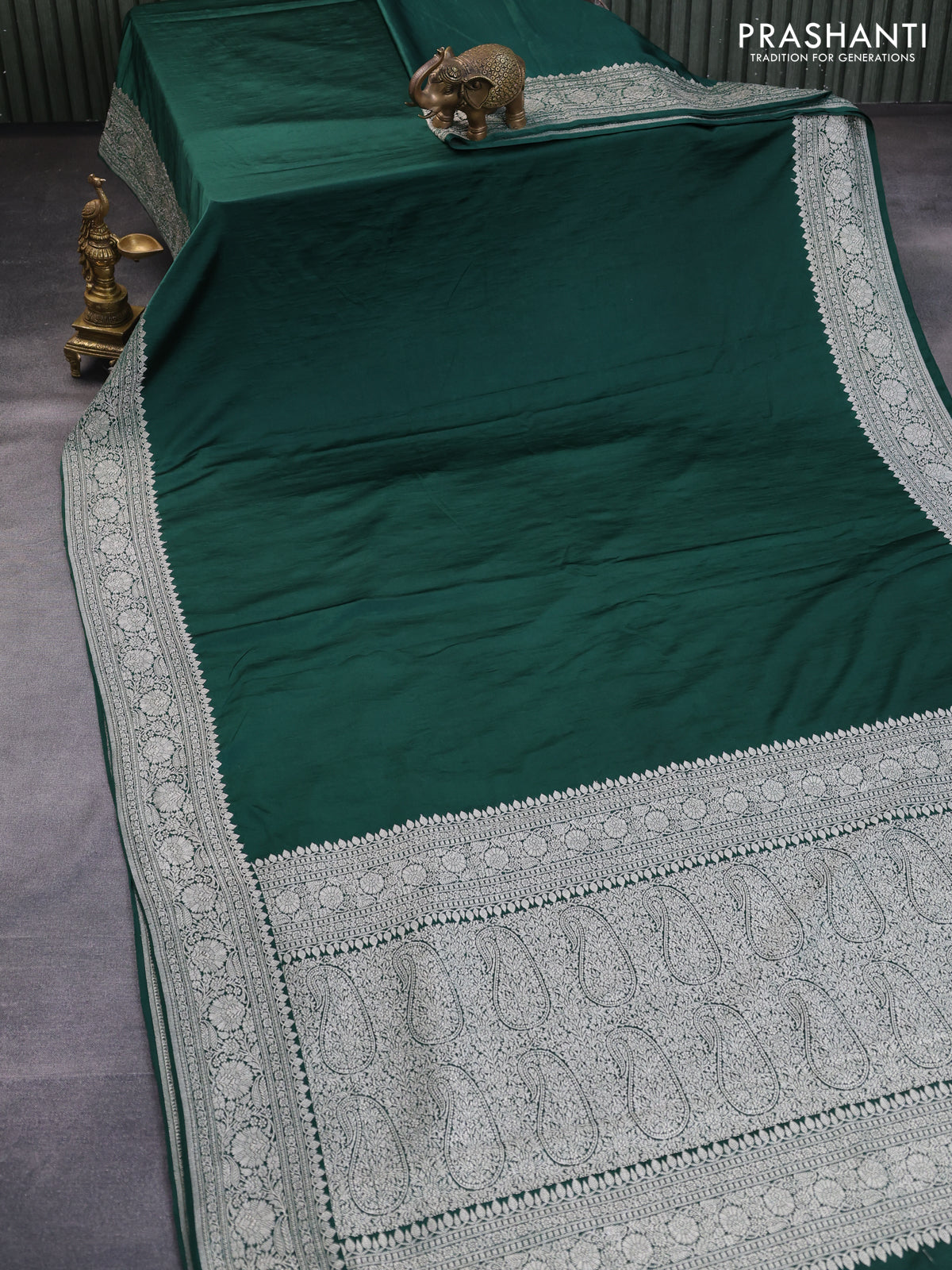 Banarasi crush crepe saree dark green with plain body and zari woven border