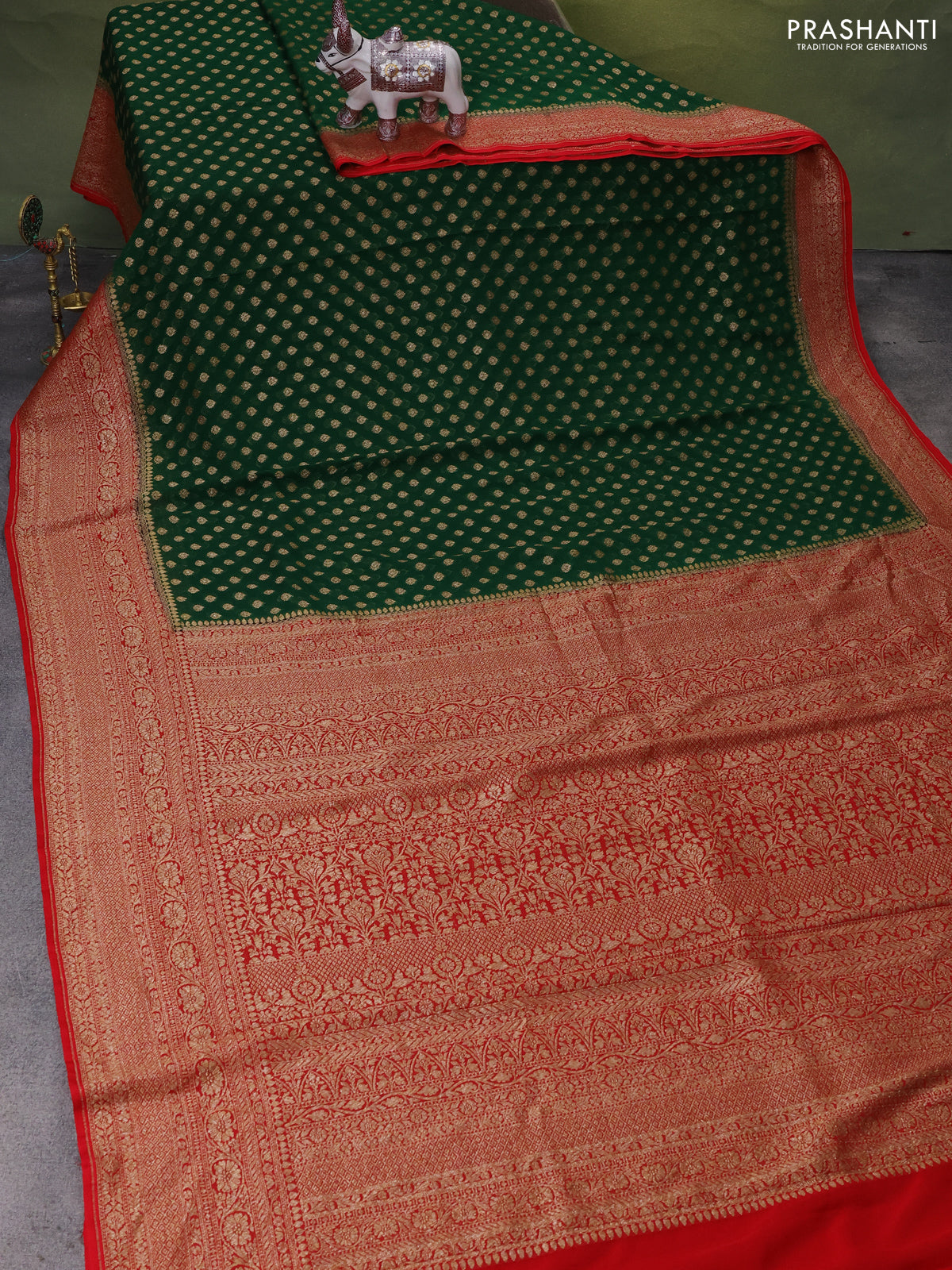 Banarasi georgette saree green and red with allover woven buttas and woven border