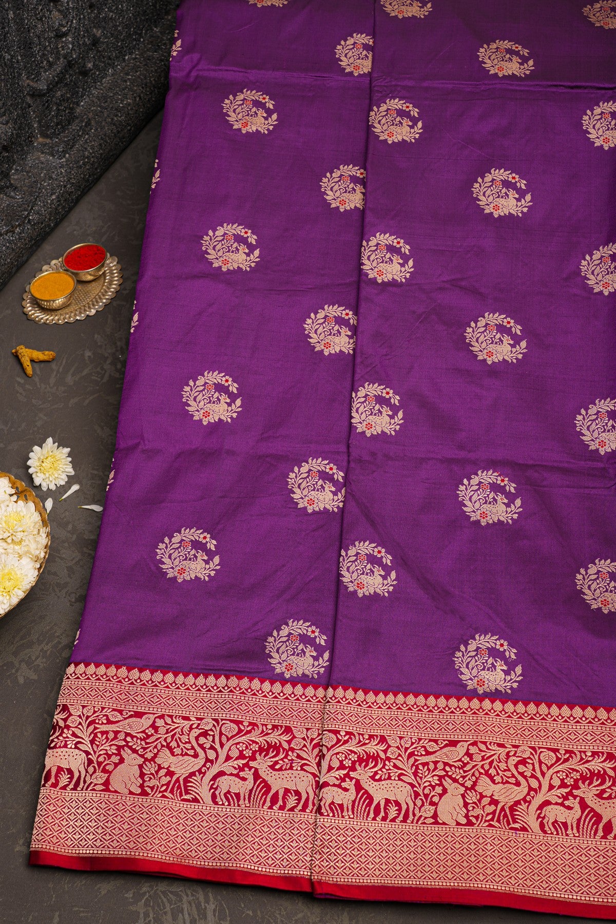 Embrace your spiritual self in this Banarasi Kathan Silk Purple Saree. This goddess inspired saree is tastefully adorned with florals and deers. The contrast border decorated with florals and animals resonates with the essence of culture. The grand brocade pallu and the regal contrast with border blouse puts together an eclectic ensemble.