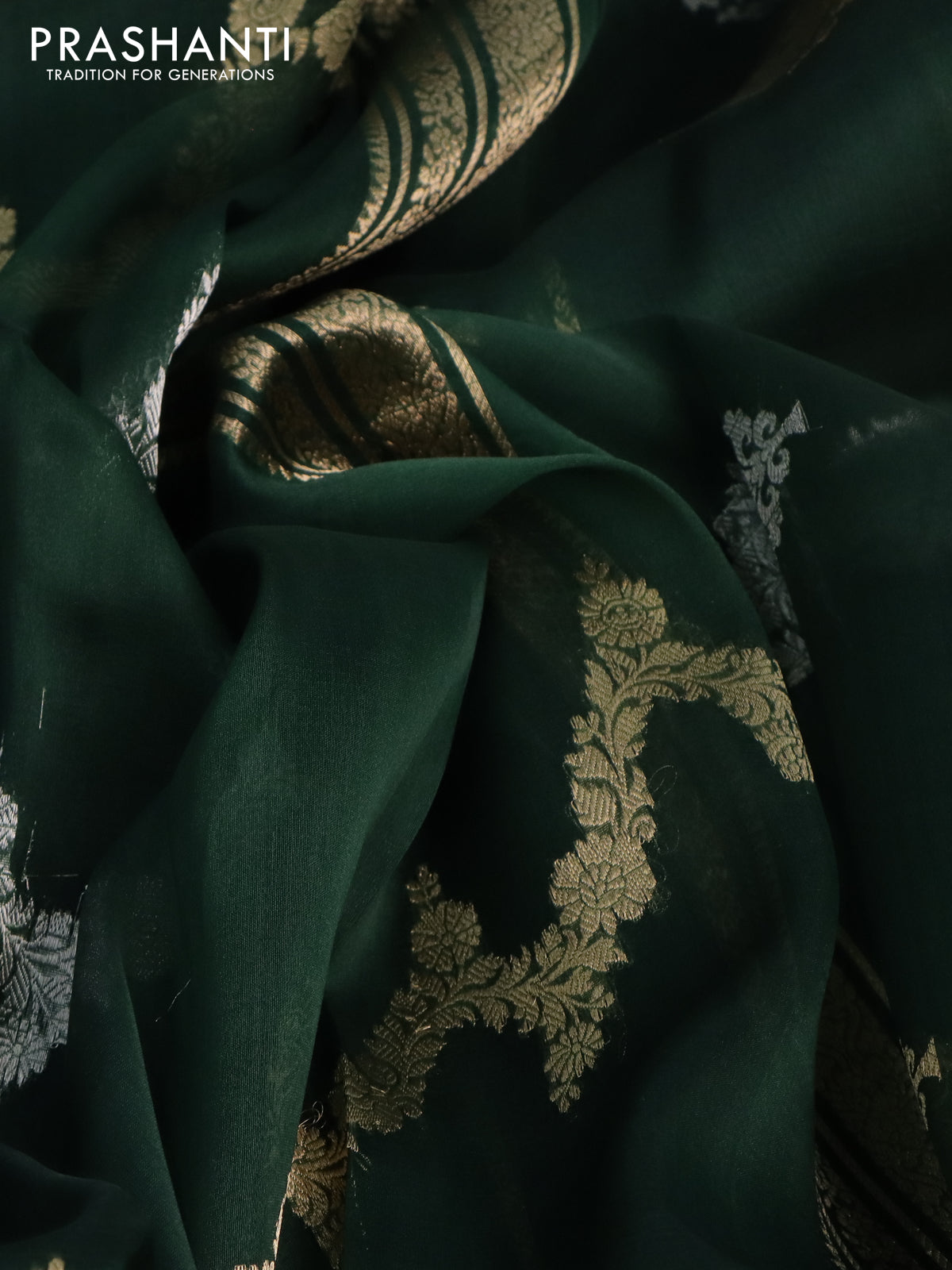Banarasi organza silk saree bottle green with silver & gold zari weaves and zari woven piping border