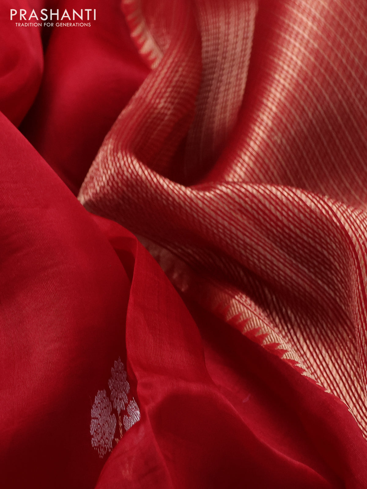 Banarasi organza silk saree maroon with zari woven floral buttas and simple border