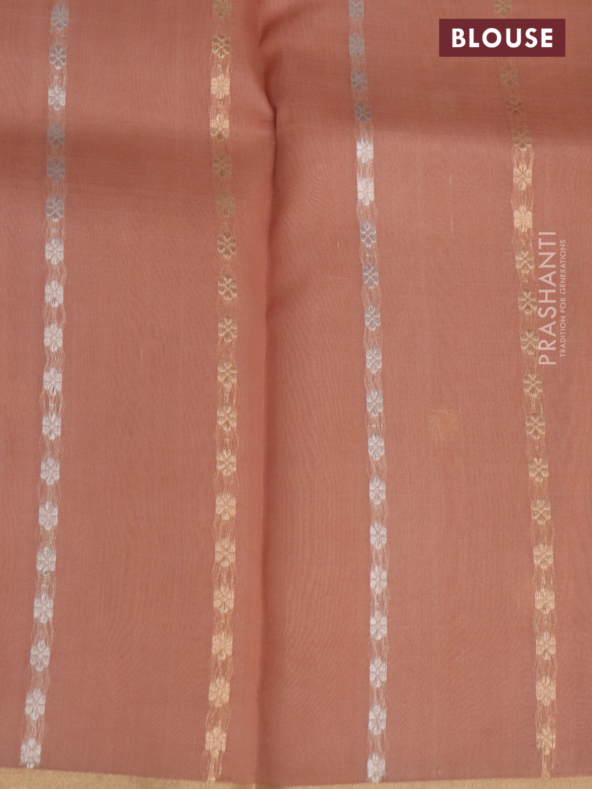 Banarasi organza silk saree pastel peach with allover silver & gold zari weaves and zari woven piping border