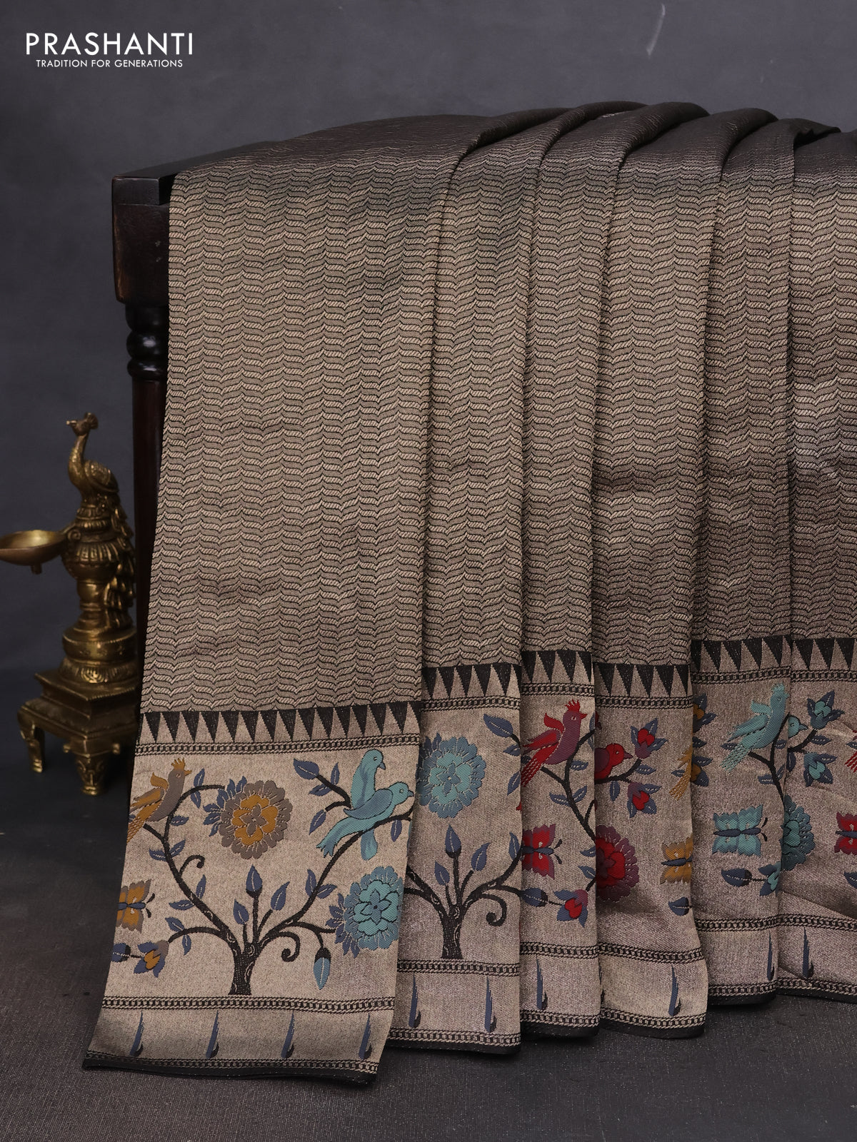 Banarasi semi raw silk saree black with allover zari woven brocade weaves and floral design paithani border
