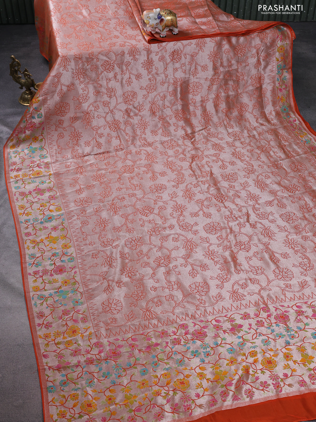 Banarasi semi raw silk saree orange with allover silver zari woven floral weaves and floral design paithani border
