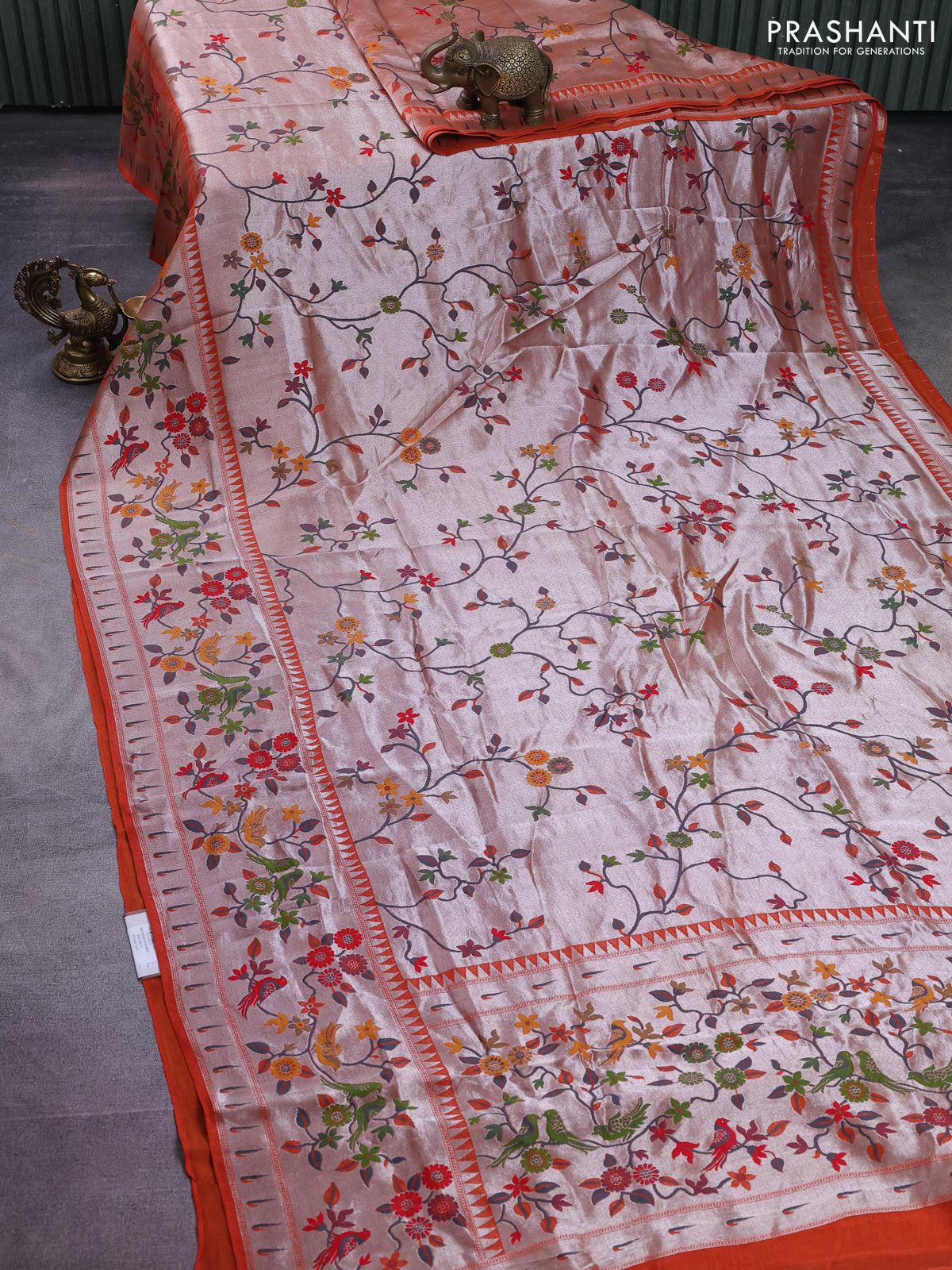 Banarasi semi raw silk saree orange with allover zari woven paithani weaves and floral design paithani border