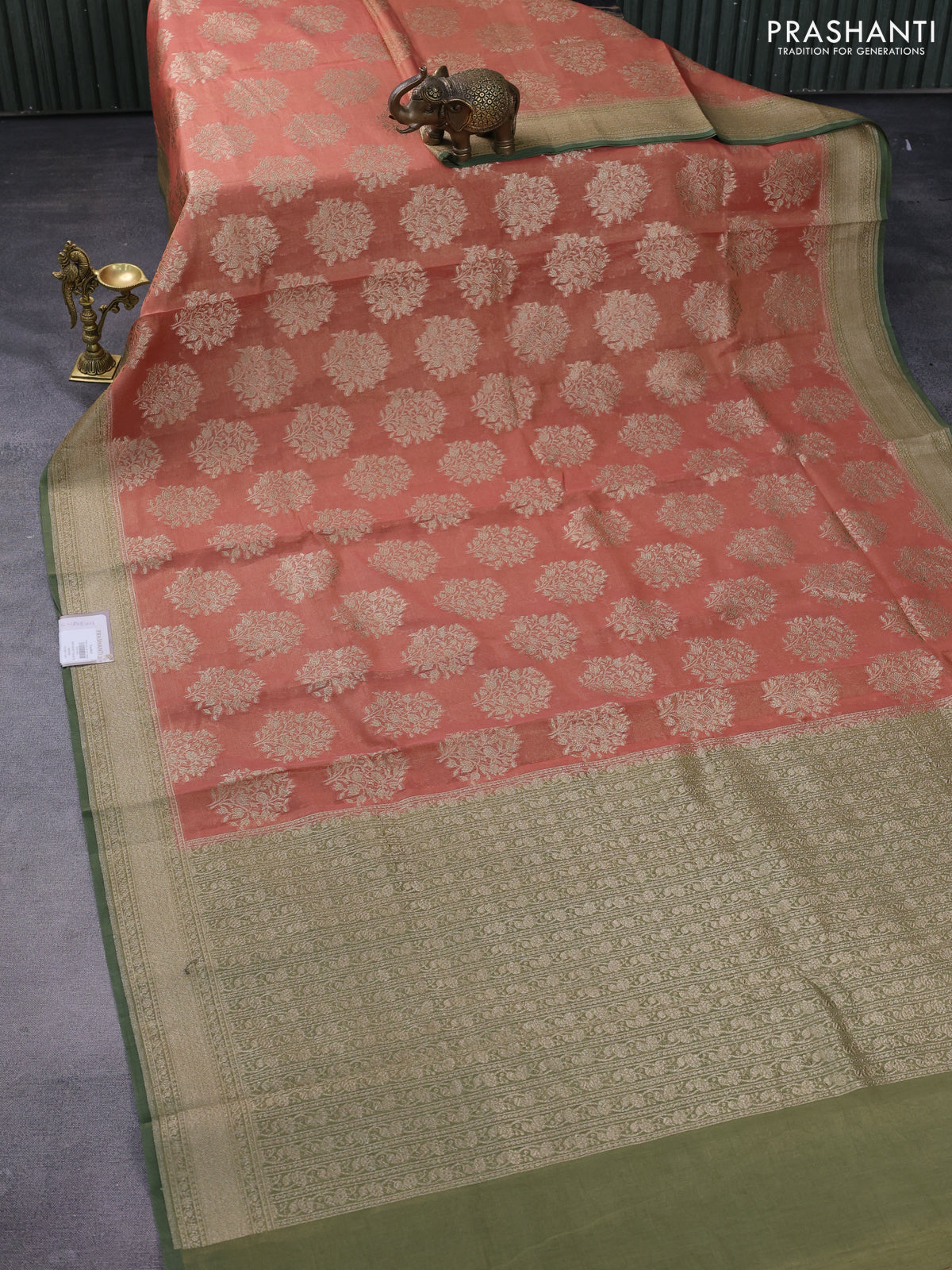 Banarasi tissue silk cotton saree rust shade and green shade with zari woven buttas and woven border