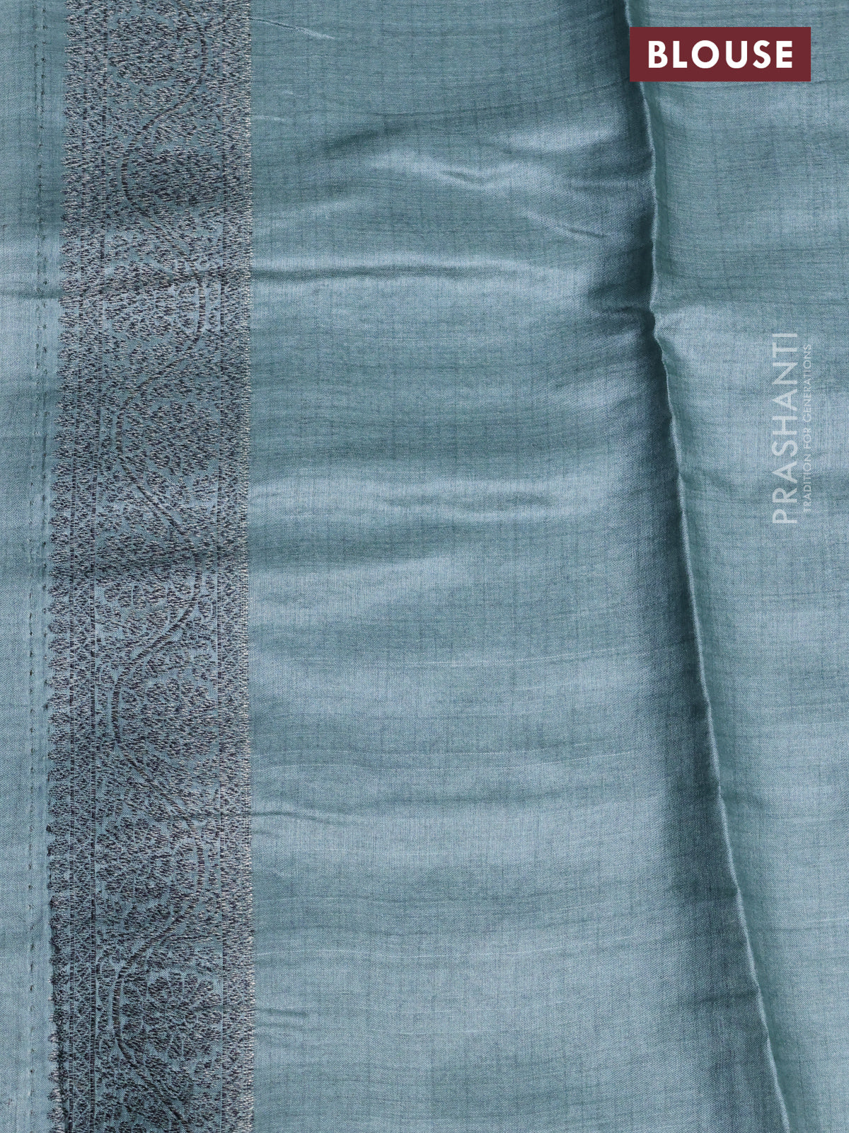 Banarasi tussar silk saree pastel blue shade with woven buttas & floral digital prints in borderless style