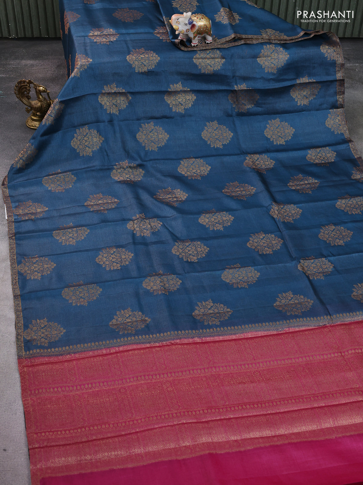 Banarasi tussar silk saree peacock plue and pink with thread & zari woven buttas and woven border