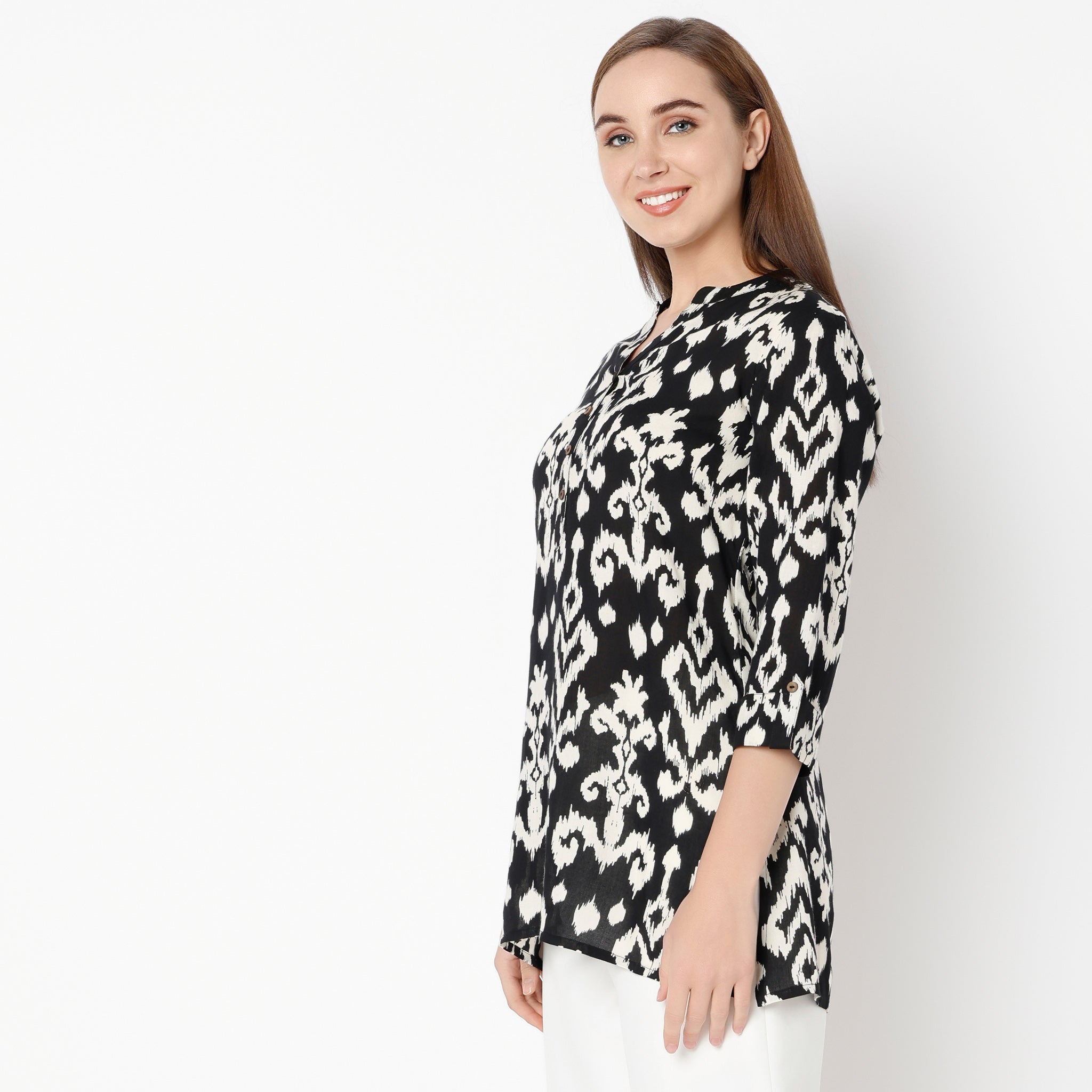 Experience the perfect blend of comfort and style with our Straight Fit Printed Band Collar Kurta. Crafted from 100% Rayon, this kurta offers a soft and breathable feel, making it ideal for all-day wear. The vibrant printed pattern adds a touch of elegance, while the band collar and three-fourth sleeves provide a modern twist to a classic design. Whether you're heading to a casual brunch or a festive gathering, this kurta is your go-to choice for effortless chic.
