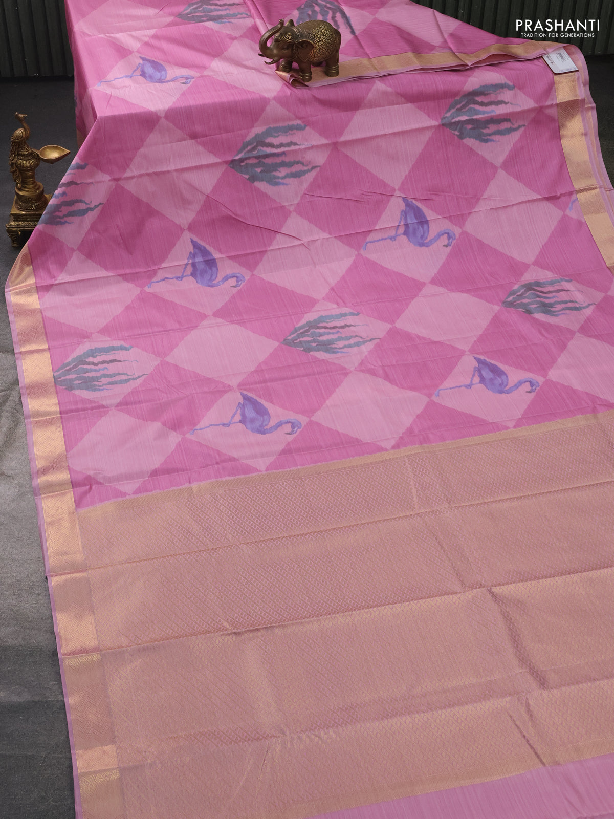 Bangalori semi silk saree pastel pink with allover ikat weaves and zari woven border