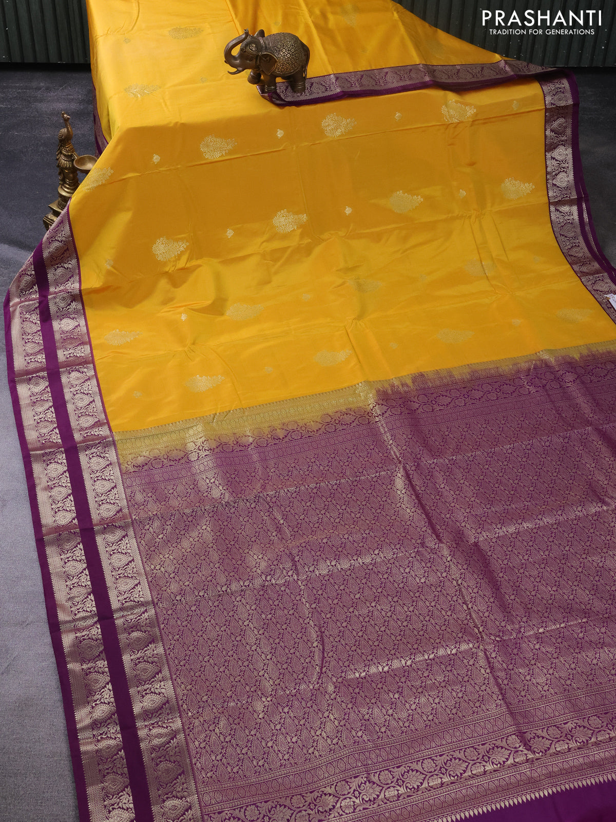 Bangalori silk saree mustard yellow and deep purple with zari woven buttas and zari woven border