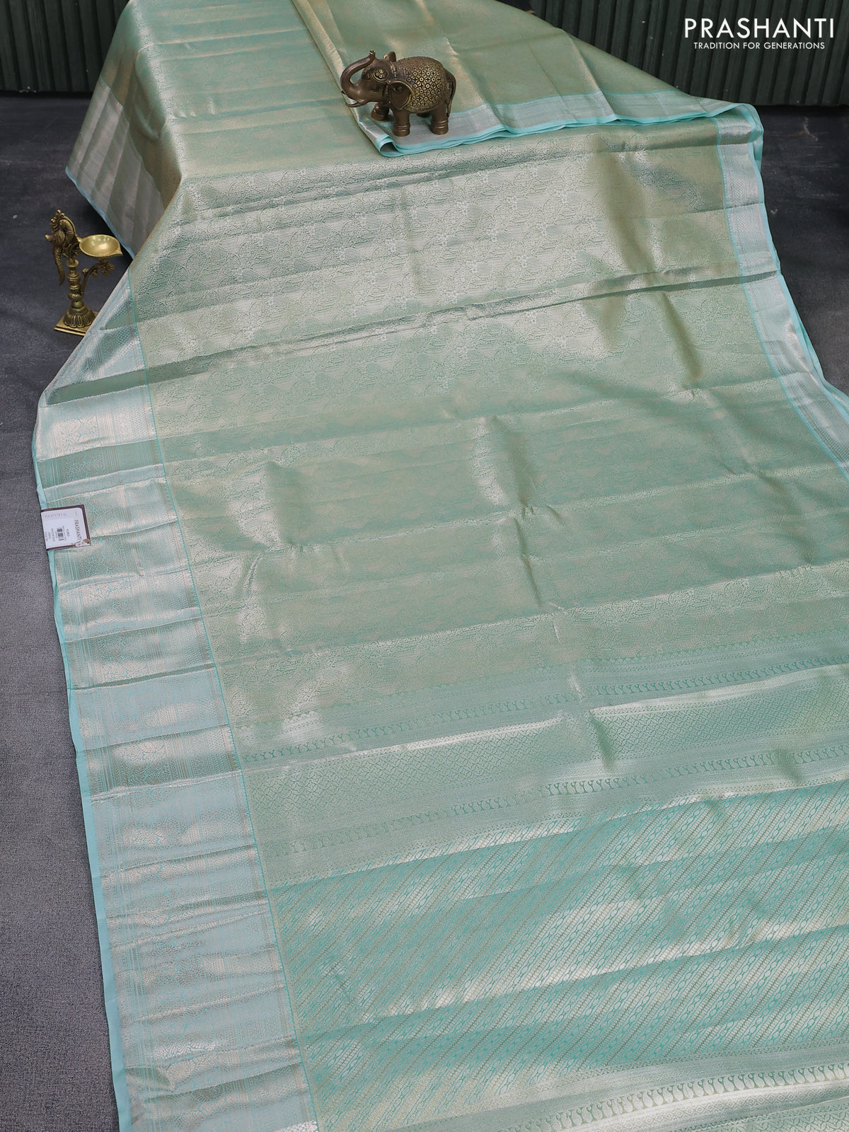 Bangalori tissue silk saree teal shade with allover zari woven brocade weaves and zari woven border