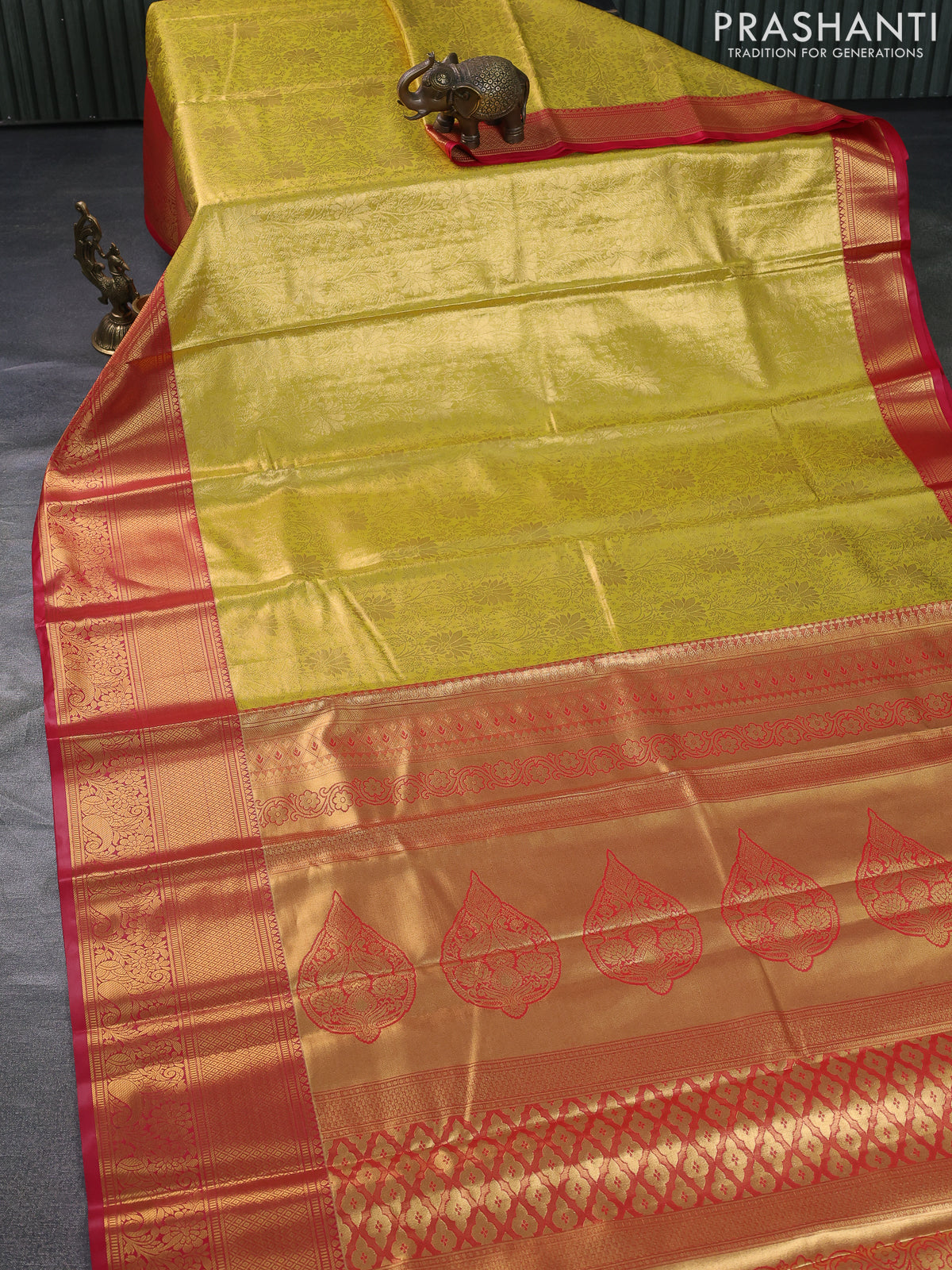 Bangalori tissue silk saree yellow and pink with allover zari woven brocade weaves and long zari woven border
