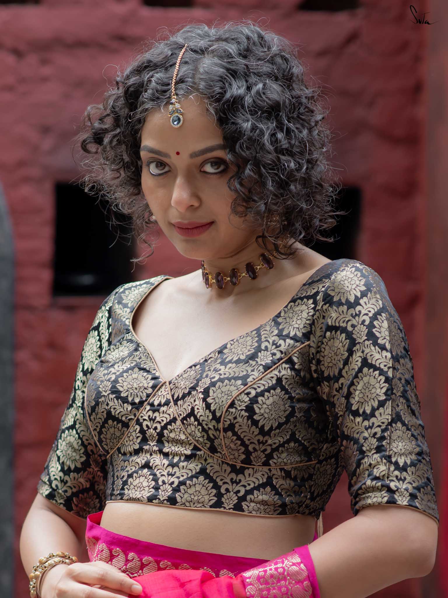 Black brocade blouse woven with rich, raised patterns. Luxurious fabric features intricate jacquard designs that catch light. Structured fit that sharpens your silhouette with style.