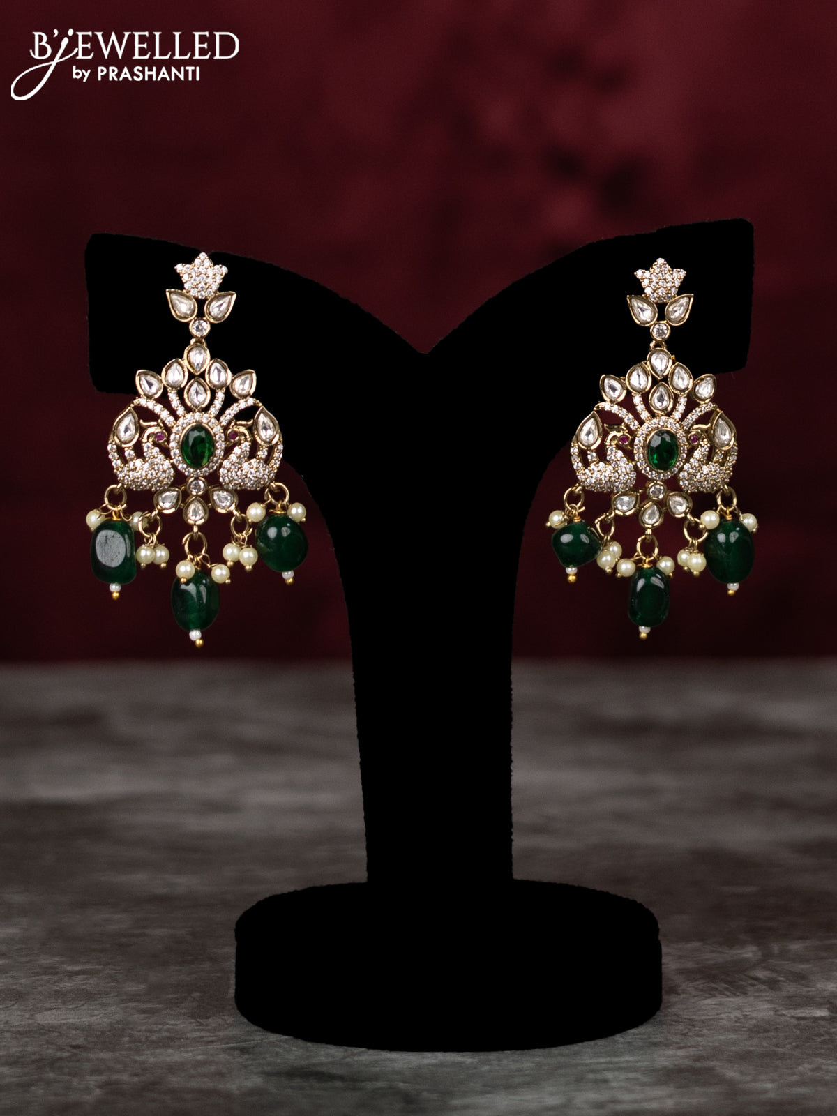 Beaded double layer green haram peacock design with emerald & kundan cz stones and pearl & beads hangings in victorian finish