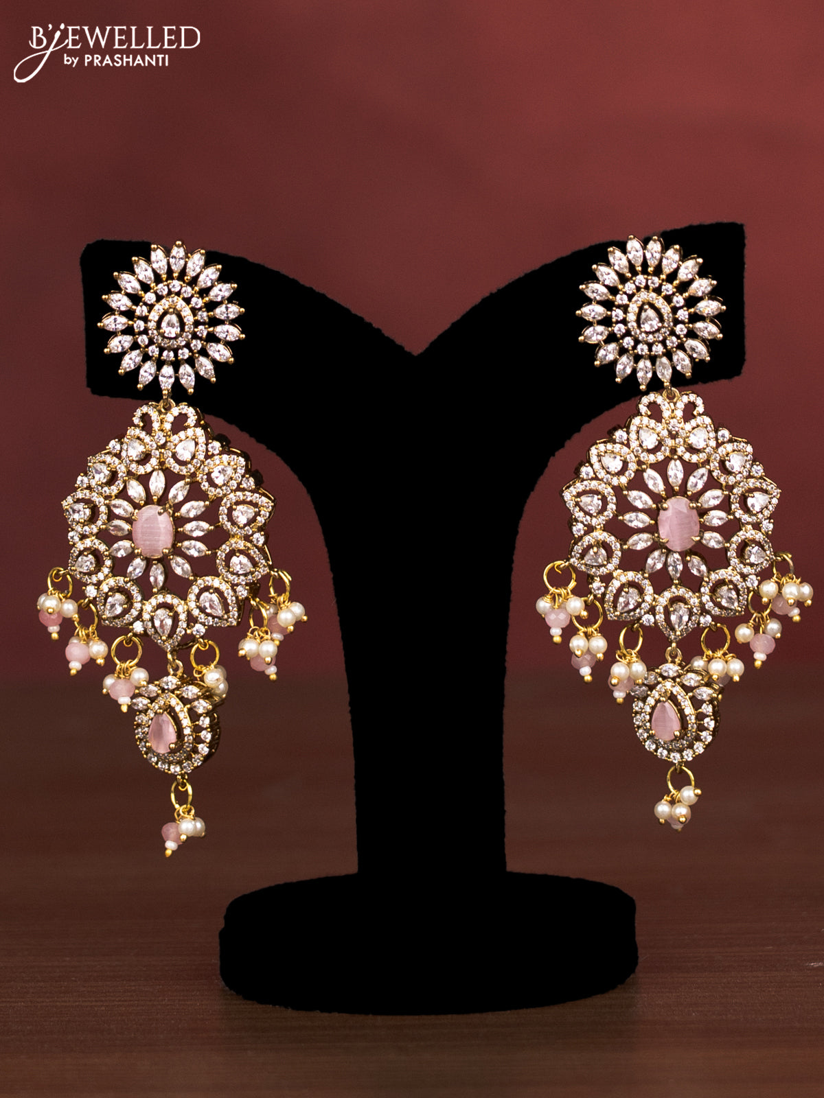 Beaded multilayer baby pink haaram with cz stones and pearl & beads hanging in victorian finish