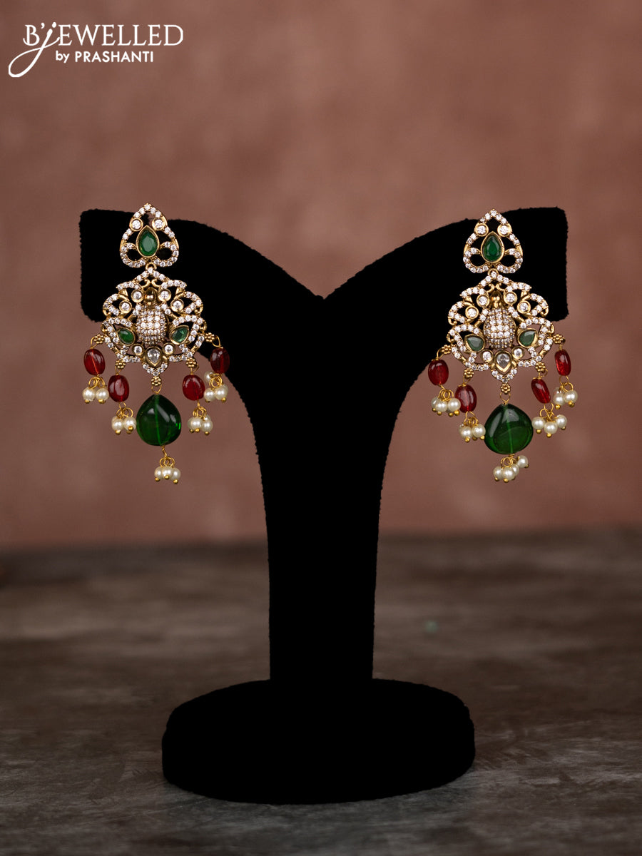 Beaded multilayer green red necklace peacock design with emerald & cz stones and pearl hangings in victorian finish