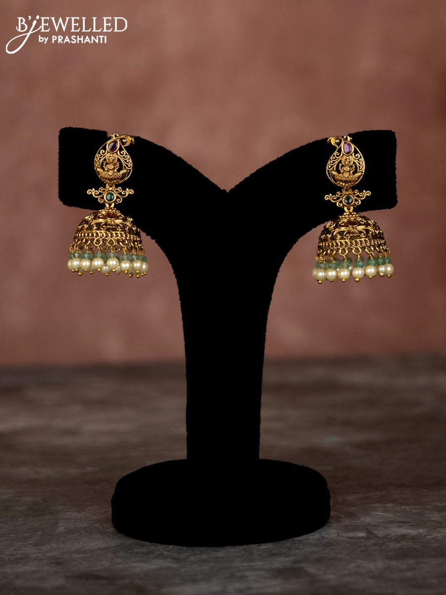 Beaded multilayer mint green necklace lakshmi pendant with kemp & cz stones and pearl hangings in victorian finish