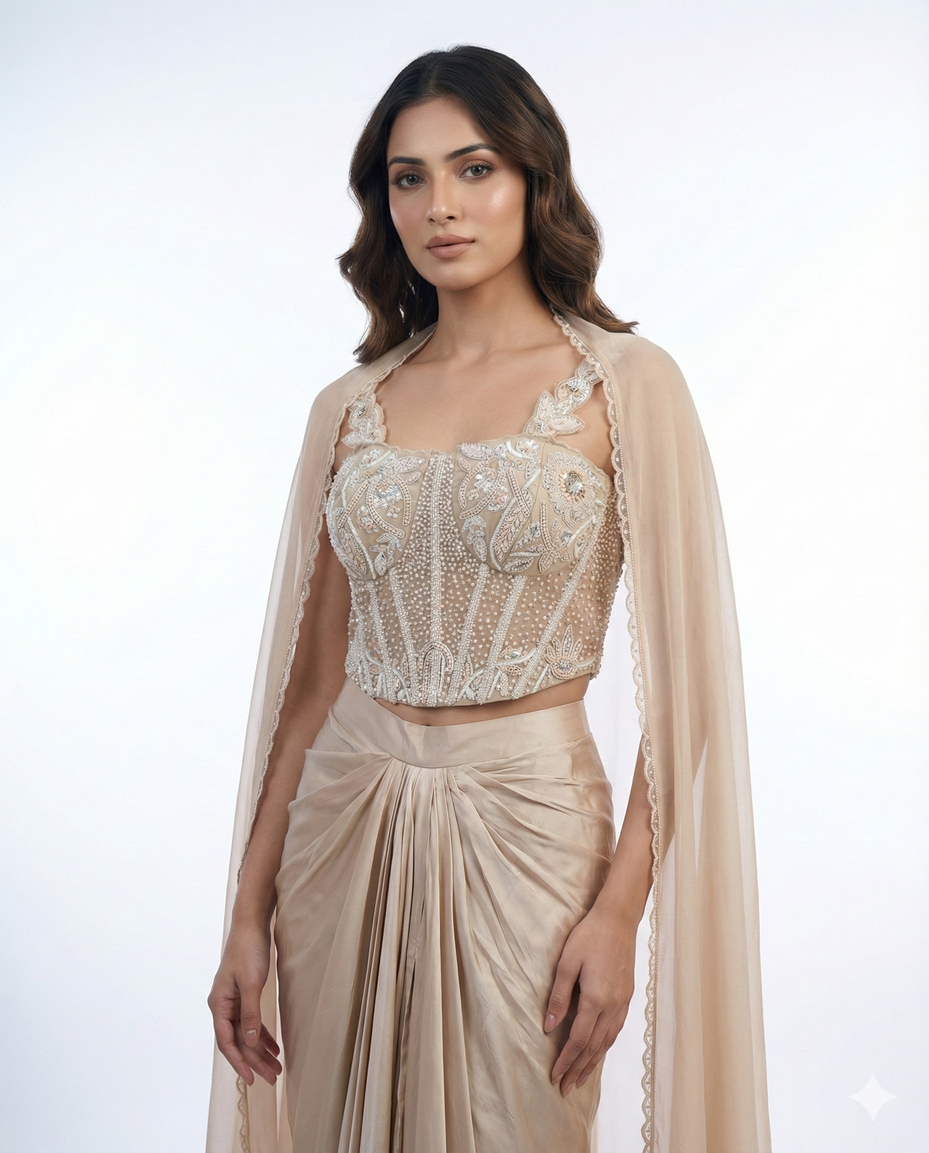 This beige cord-fit Indo-Western blouse features intricate hand jarkan embroidery, paired with a stylish jacket for a modern edge. The ensemble is completed with a chic tulip skirt in crepe fabric, offering a perfect blend of contemporary sophistication and traditional craftsmanship—ideal for festive occasions, sangeet functions, and upscale celebrations.