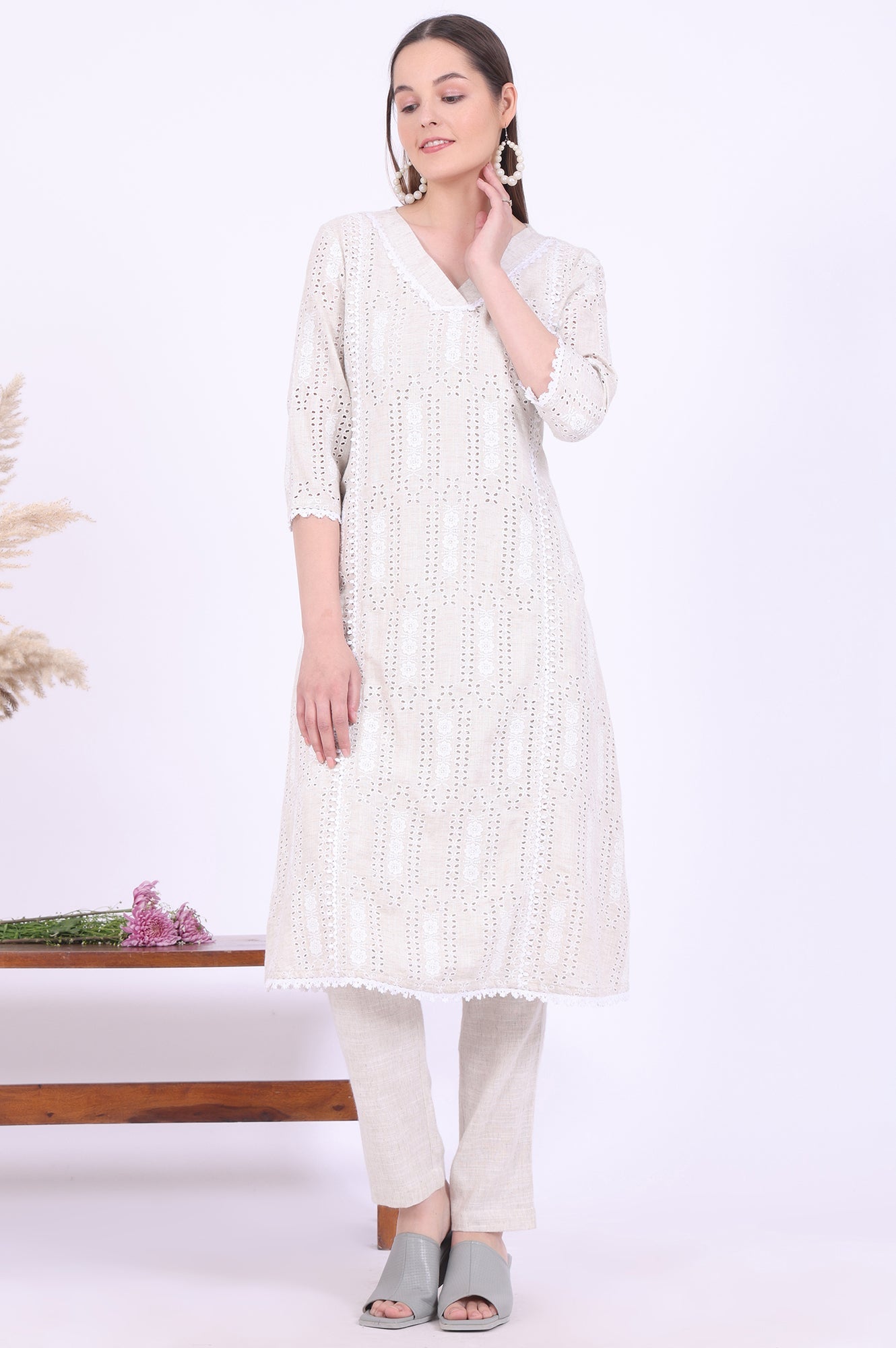Discover the perfect blend of style and comfort with this fusion ethnic set from Aurelia. The v-neck kurta features exquisite schiffli detailing, adding a touch of elegance to your ensemble. Crafted from a luxurious blend of 90% viscose and 10% flax, this a-line kurta paired with trousers offers both comfort and breathability. The three-quarter sleeves provide versatility for various occasions, making it an ideal choice for special events. The khadi color exudes a timeless charm, while the machine-washable fabric ensures easy maintenance. This woven set combines traditional elements with contemporary design, making it a must-have addition to your wardrobe. Embrace the fusion of style and tradition with this stunning ethnic set from Aurelia.