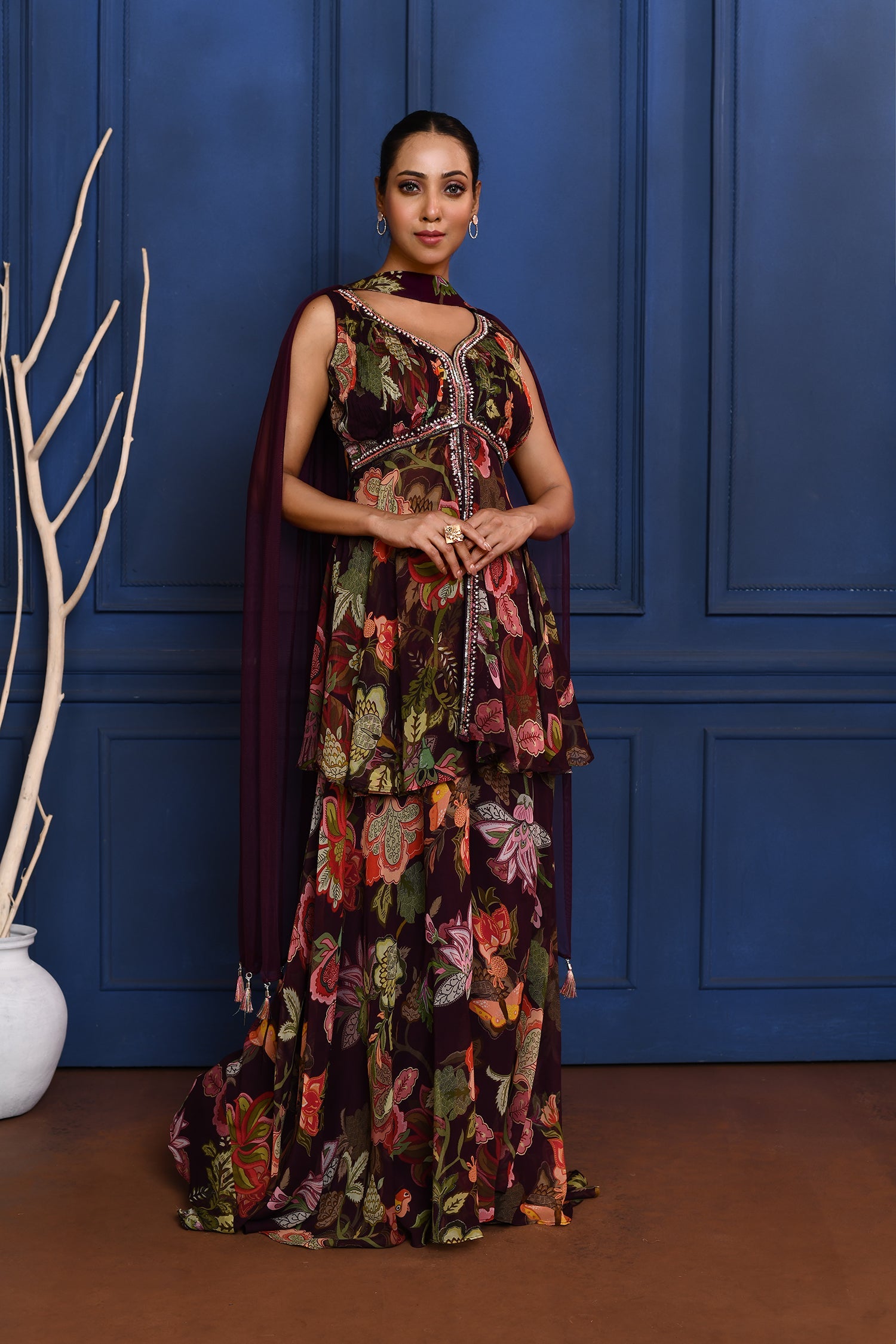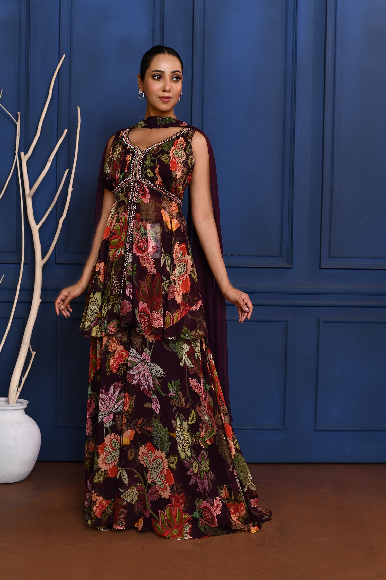 The berry purple floral georgette peplum set with matching sharara and dupatta for a stylish ethnic look with subtle elegance.