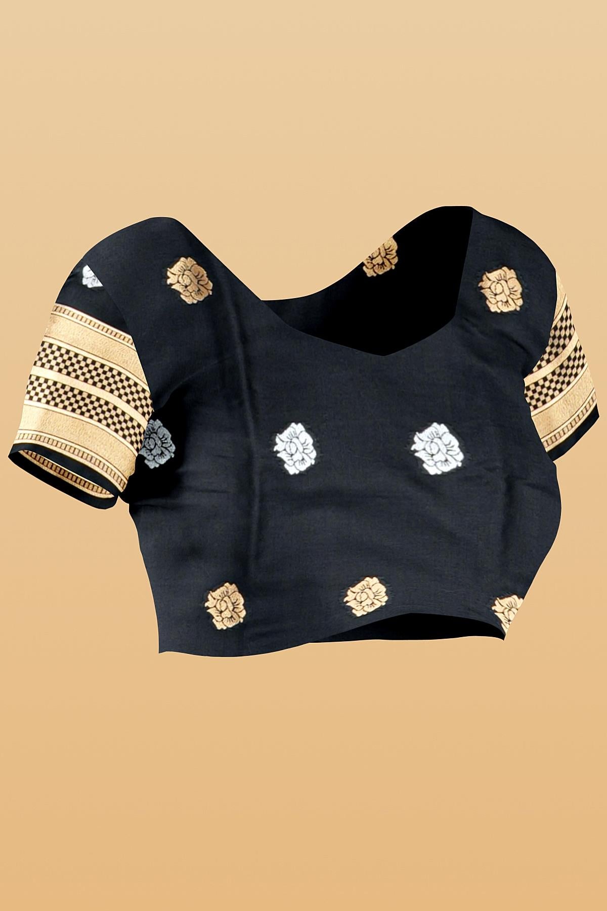 Latest BLACK FLORALS SILK BLEND Saree with SELF ZARI border. This saree comes with PLAIN WITH BORDER SILK BLEND blouse.