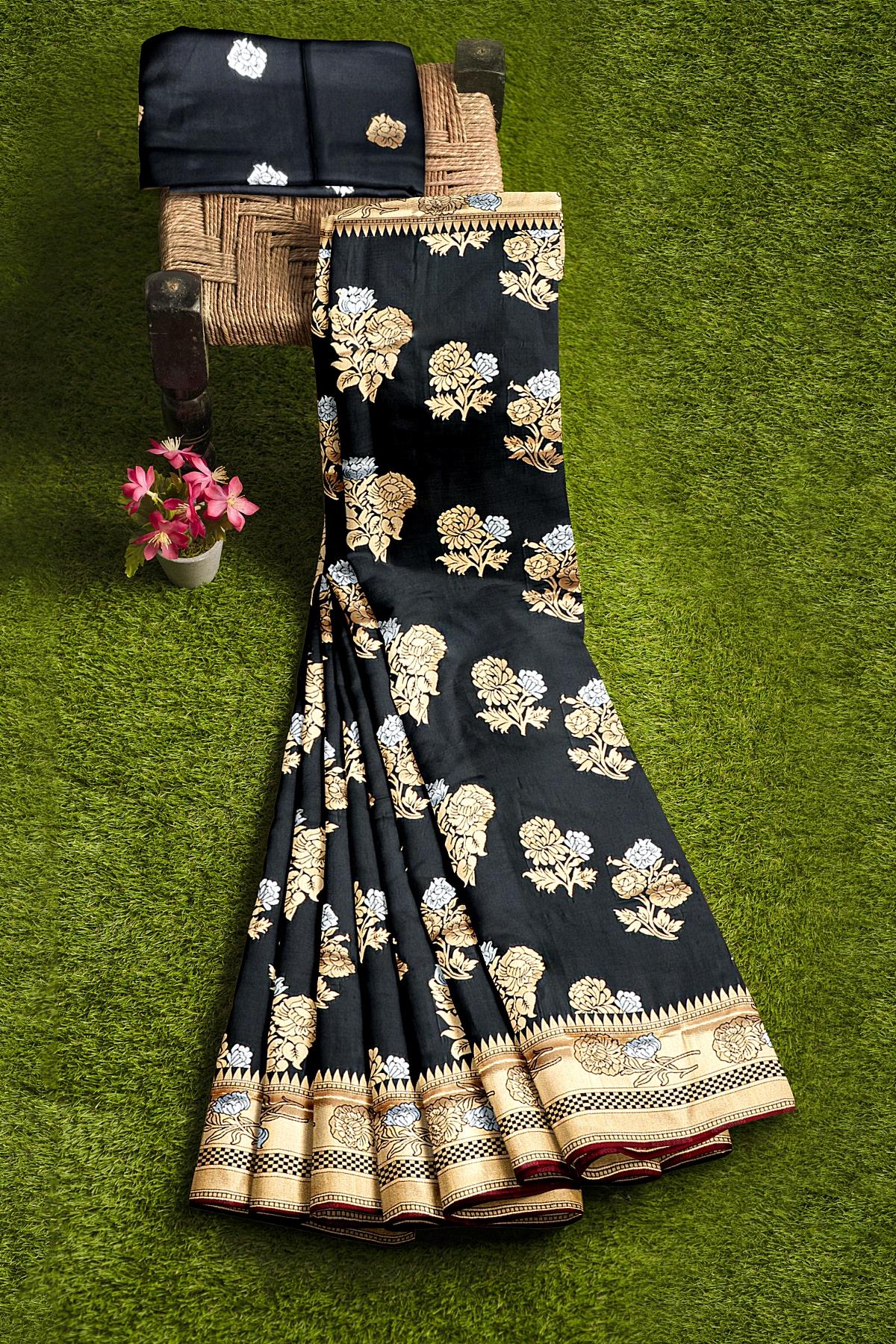 BLACK and GOLD FLORALS SILK BLEND Saree with SEMI PATTU