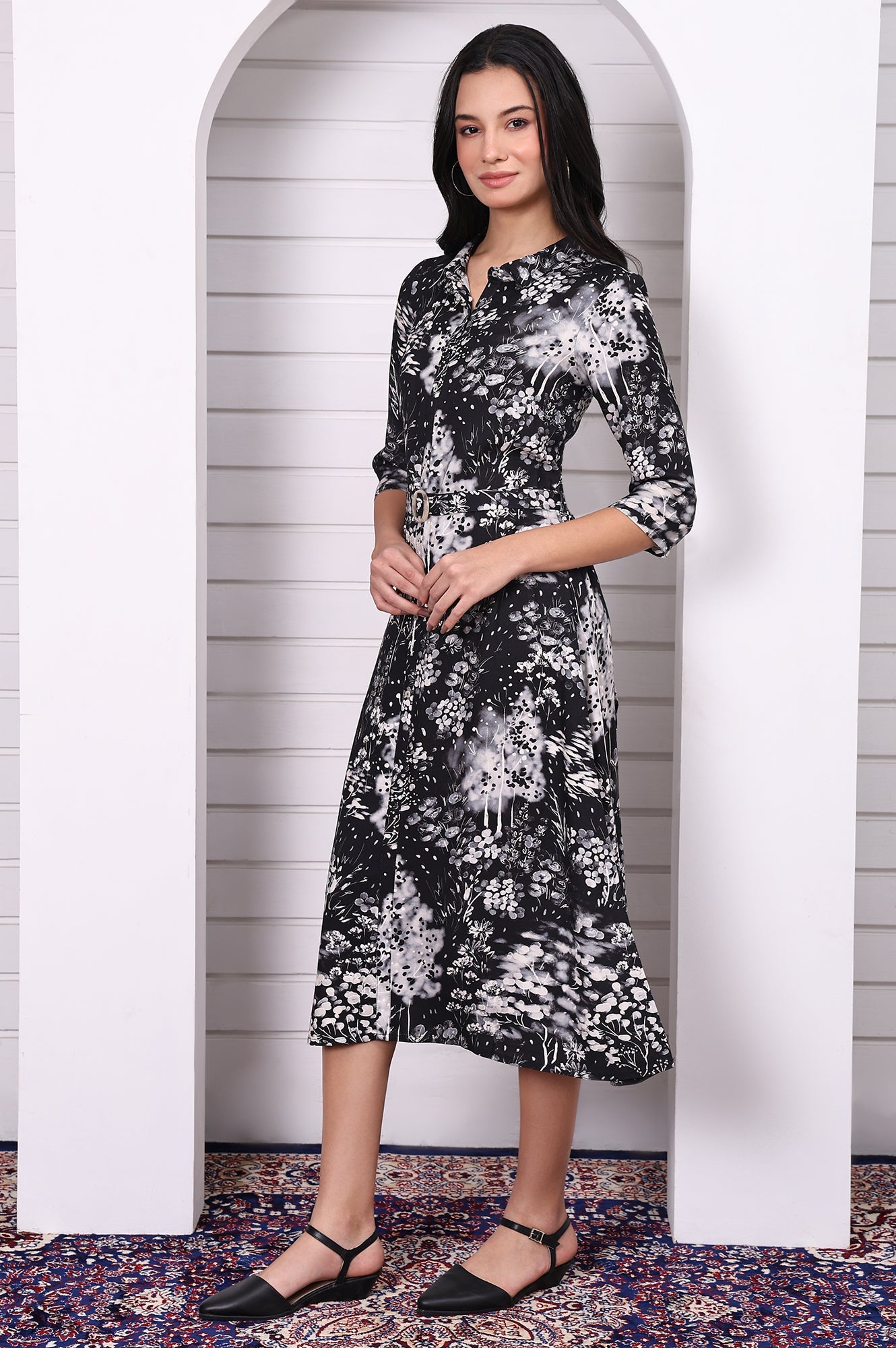 Crafted in a fluid, soft-touch fabric, this dress features an all-over floral print in muted tones that pop against the deep black base. The flared silhouette adds movement and charm, while the detachable waist belt defines the shape for a flattering fit. With 3/4th sleeves and shirt collar neckline, this floral print black flared dress is an ideal choice for casual outings, day events, or weekend getaways. Its above-knee length and easy fit make it a chic fusion of Indian motifs and modern style.