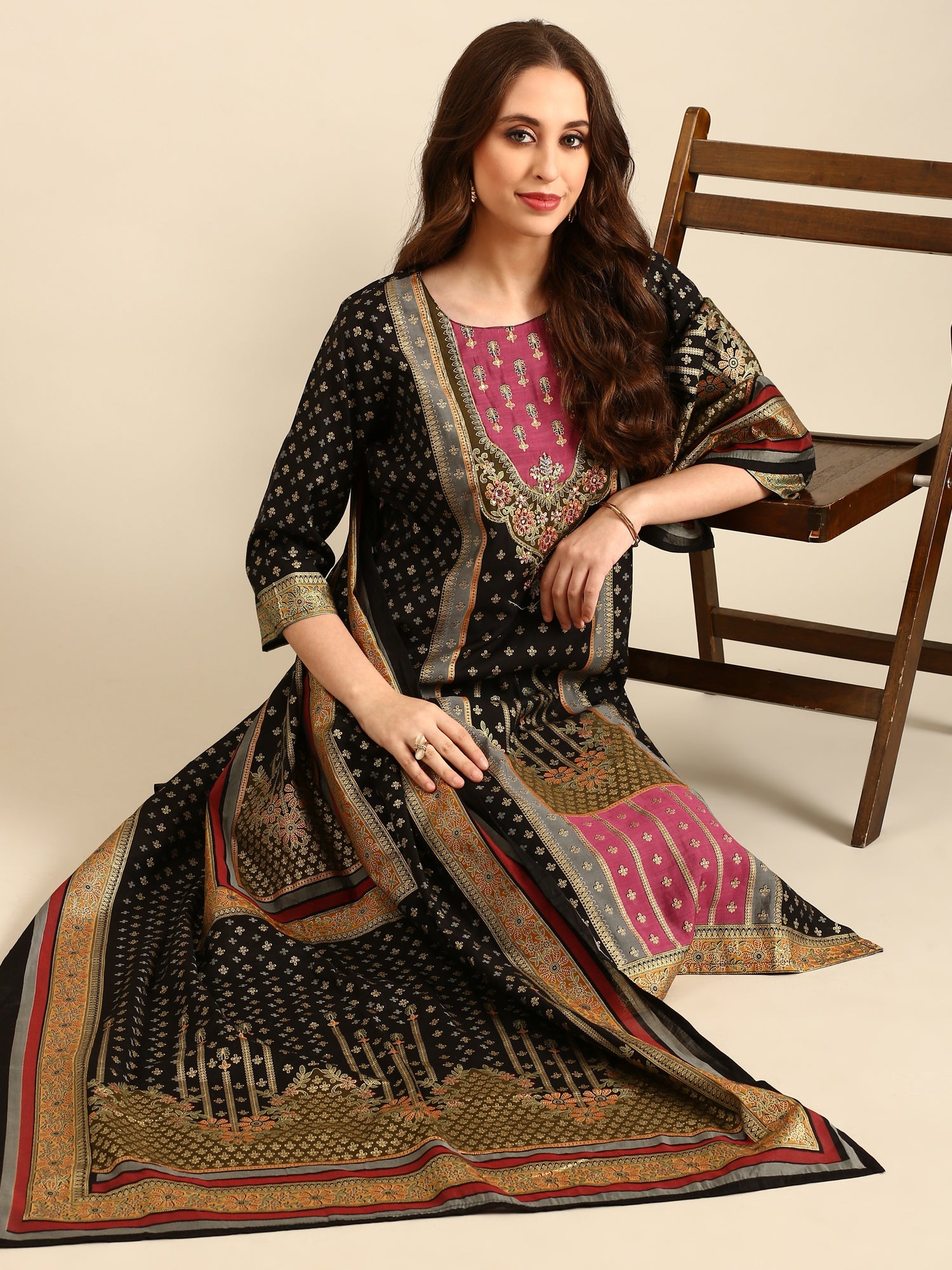 Black Foil printed kurta set with silk duppata