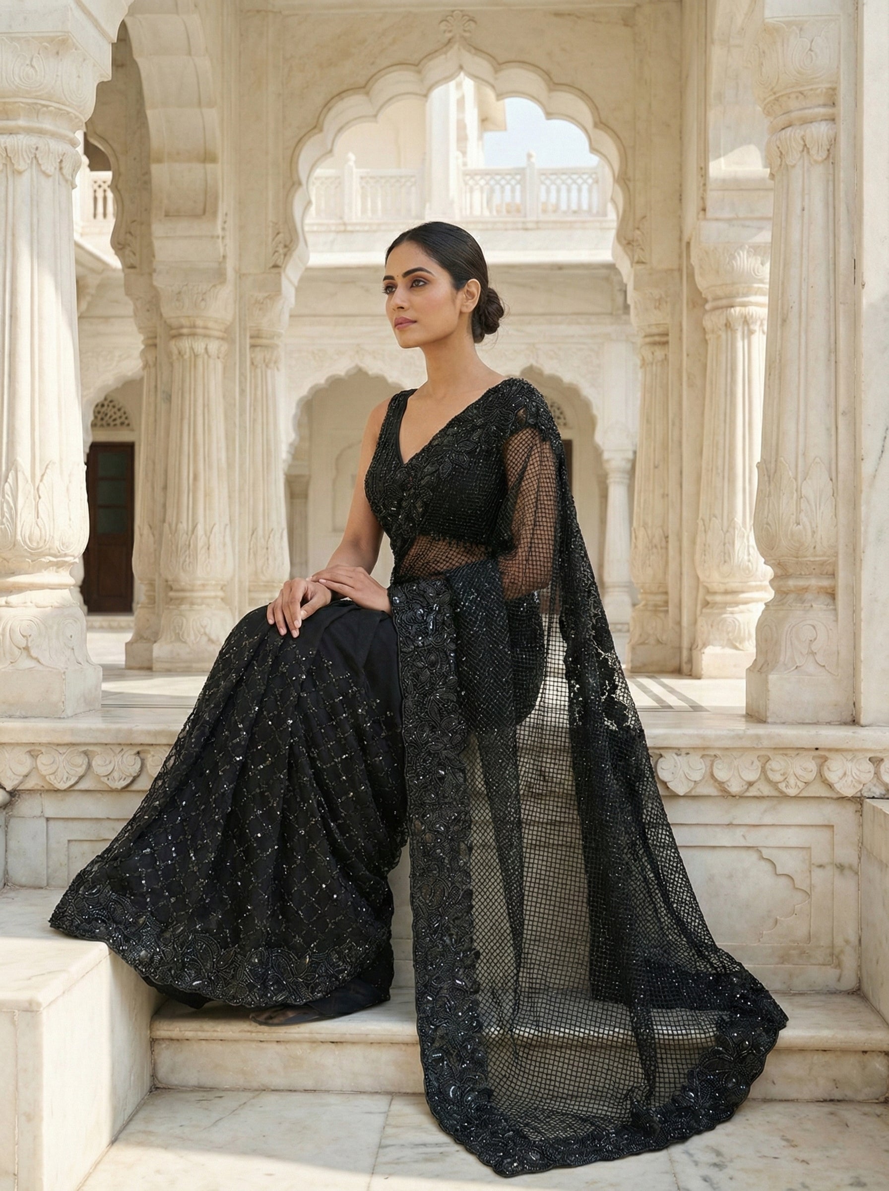 Elevate your ethnic wardrobe with this stunning black net saree, meticulously crafted with intricate floral sequin and bead embellishments. The sheer net fabric creates an ethereal drape while the heavy embroidery work adds dramatic visual impact, making it ideal for weddings, celebrations, and special occasions. The coordinated readymade blouse ensures effortless styling, allowing you to look polished without additional tailoring. Perfect for those seeking sophisticated traditional wear with contemporary flair.