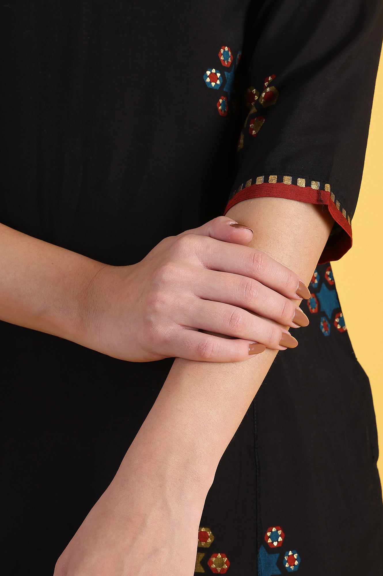 Make a lasting impression at your next special occasion with this exquisite black ethnic set from W. This fusion-inspired ensemble comprises a straight kurta, sharara, and dupatta, offering a perfect blend of traditional charm and modern aesthetics. The woven construction ensures durability, while the viscose fabric provides a luxurious feel and elegant drape. The kurta features a v-neckline and three-quarter sleeves, striking the perfect balance between modesty and style. The highlight of this set is the stunning metallic embroidery, which adds a touch of glamour and sophistication to your look. The slit detail on the kurta adds a contemporary flair to the overall design. Tailored for women who appreciate fine craftsmanship, this hand-wash friendly set is ideal for special events, festivals, or evening gatherings. The versatility of this ethnic set allows you to create multiple looks, making it a valuable addition to your occasion wear collection.