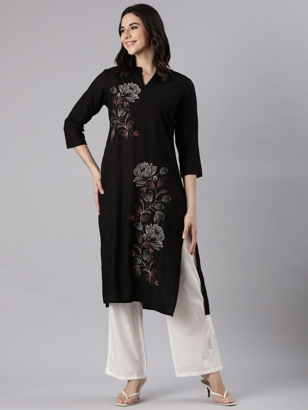 Elevate your ethnic wardrobe with this Black Rayon Embroidered Kurta, crafted for a refined and sophisticated look. The breathable rayon fabric ensures comfort while the delicate embroidery adds a touch of timeless elegance. Perfect for both formal occasions and stylish everyday wear, this kurta seamlessly combines tradition with contemporary charm.