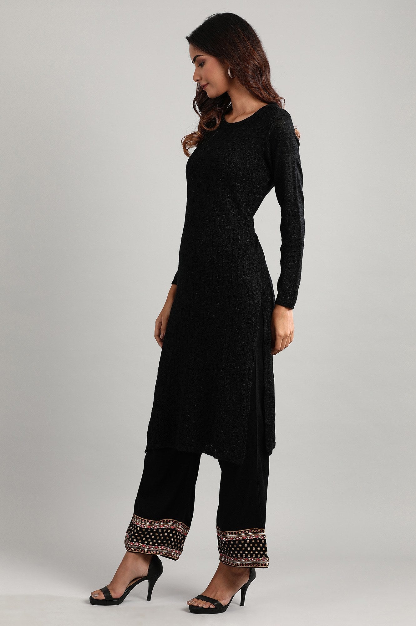 Black round neck full sleeve self-designed kurta with side slits.