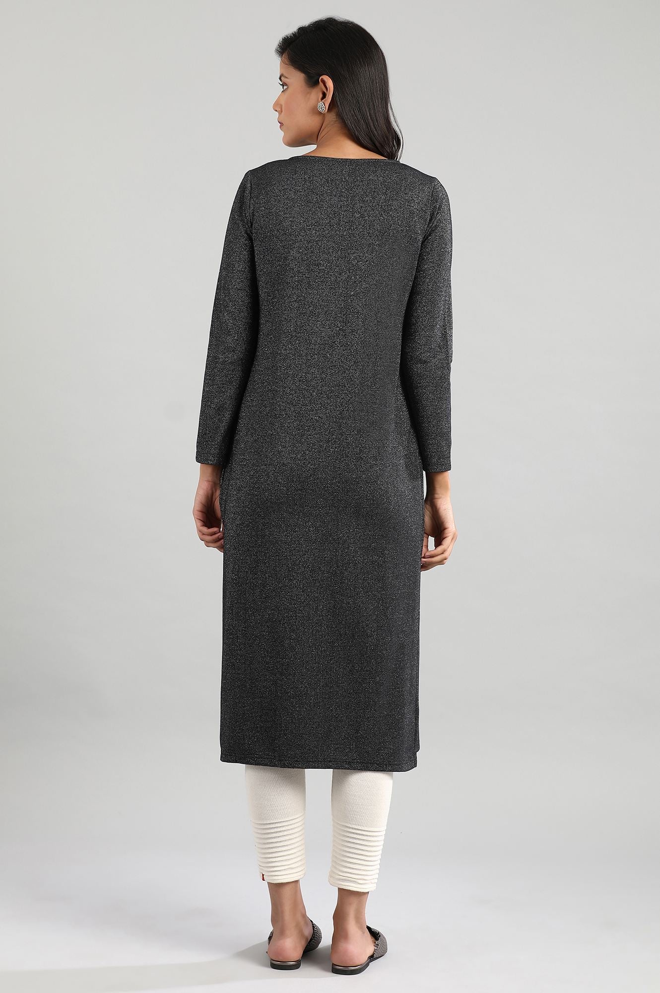 Black round neck full sleeve knitted kurta with zari embroidery detail and side slits.