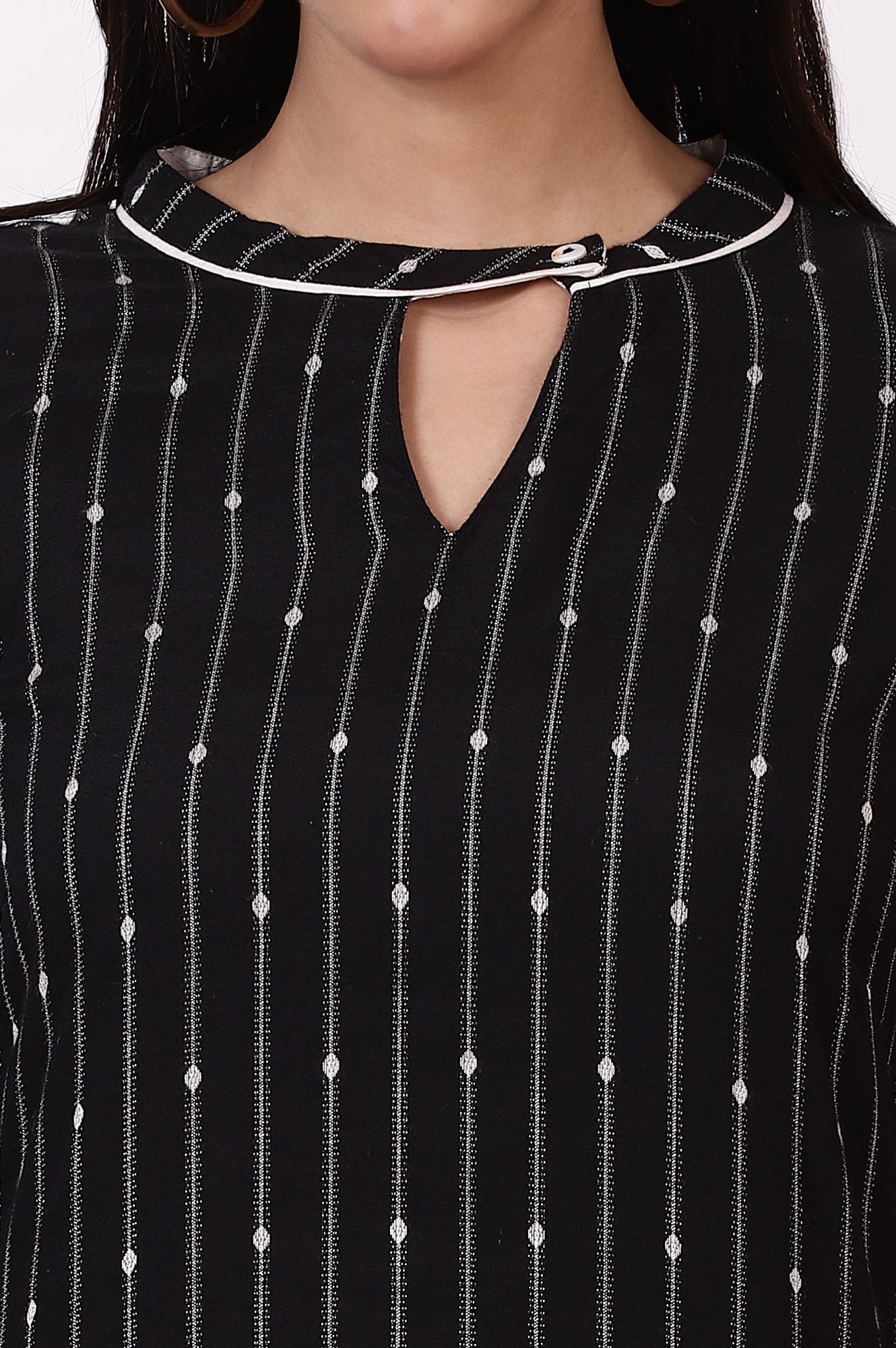 The black kurta and jegging set is a stunning piece that is perfect for those who value sophistication and style. Made from yarn dyed dobby, this kurta is both comfortable and durable, ensuring a long-lasting and enjoyable wear. The mandarin collar with button closure, and V-slit create an understated yet elegant look, while the cuff detail in sleeves with contrast piping adds a unique and captivating element to the design. The kurta comes with black jeggings which will hit the right note for casual look.
