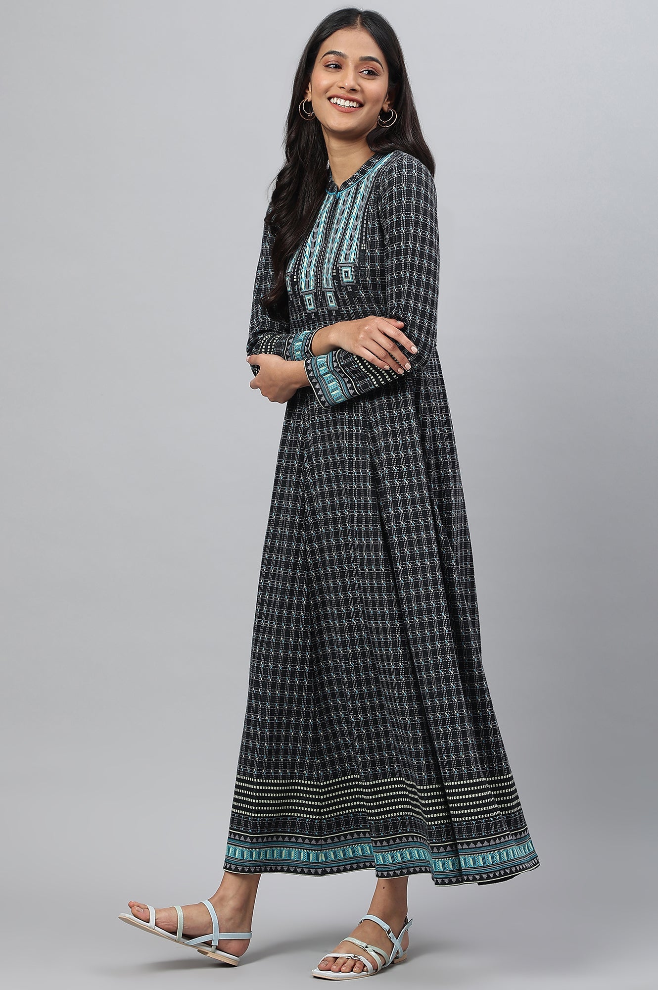 Keep yourself warm and comfortable by putting on this floor length dress. It features a fine geometric design on the yoke, a mandarin collar and full length placement sleeves.