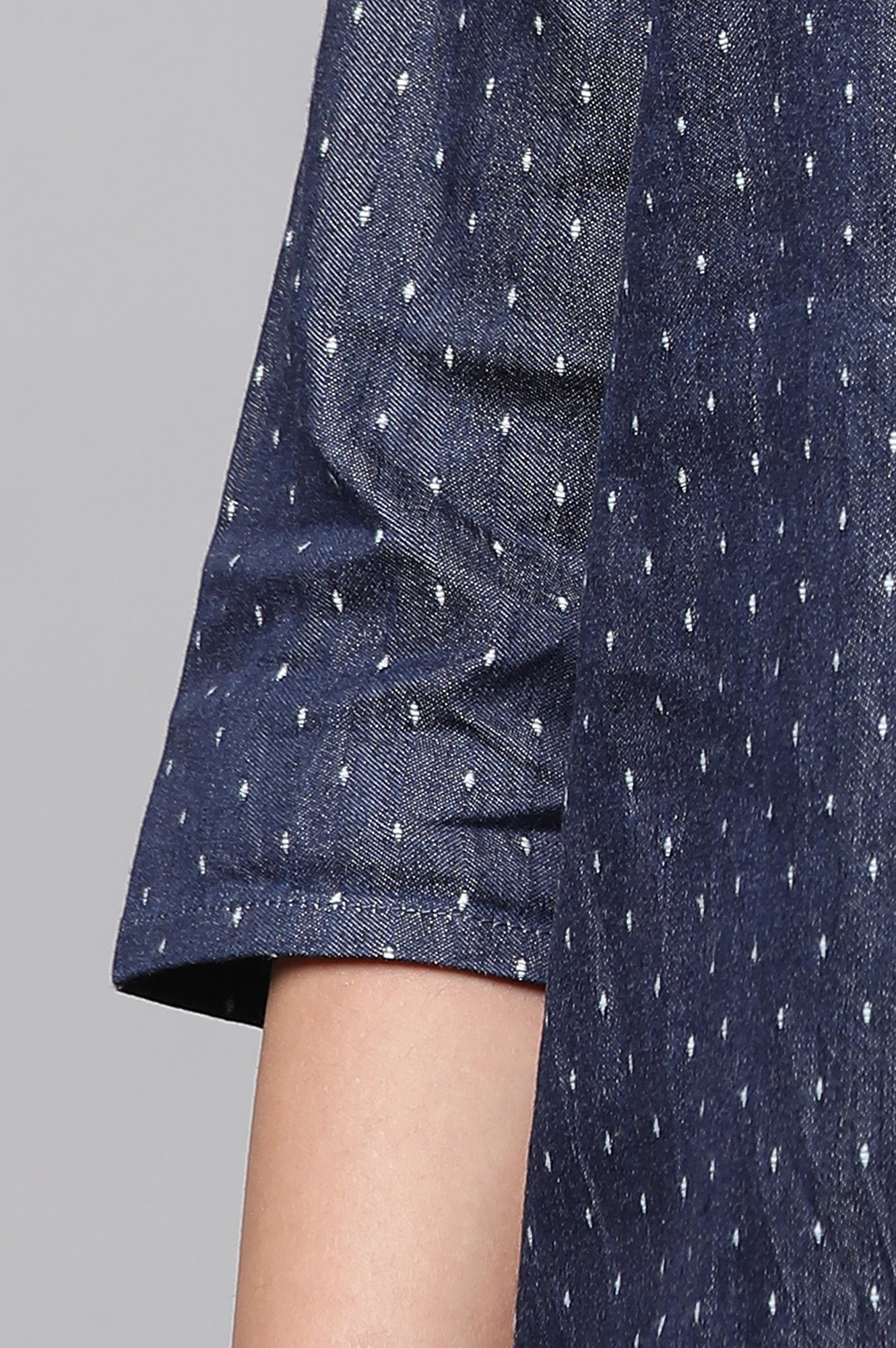 Crafted in premium fabric, which gives you all day comfort and classy look. This short denim kurti has round neck and white dot print.