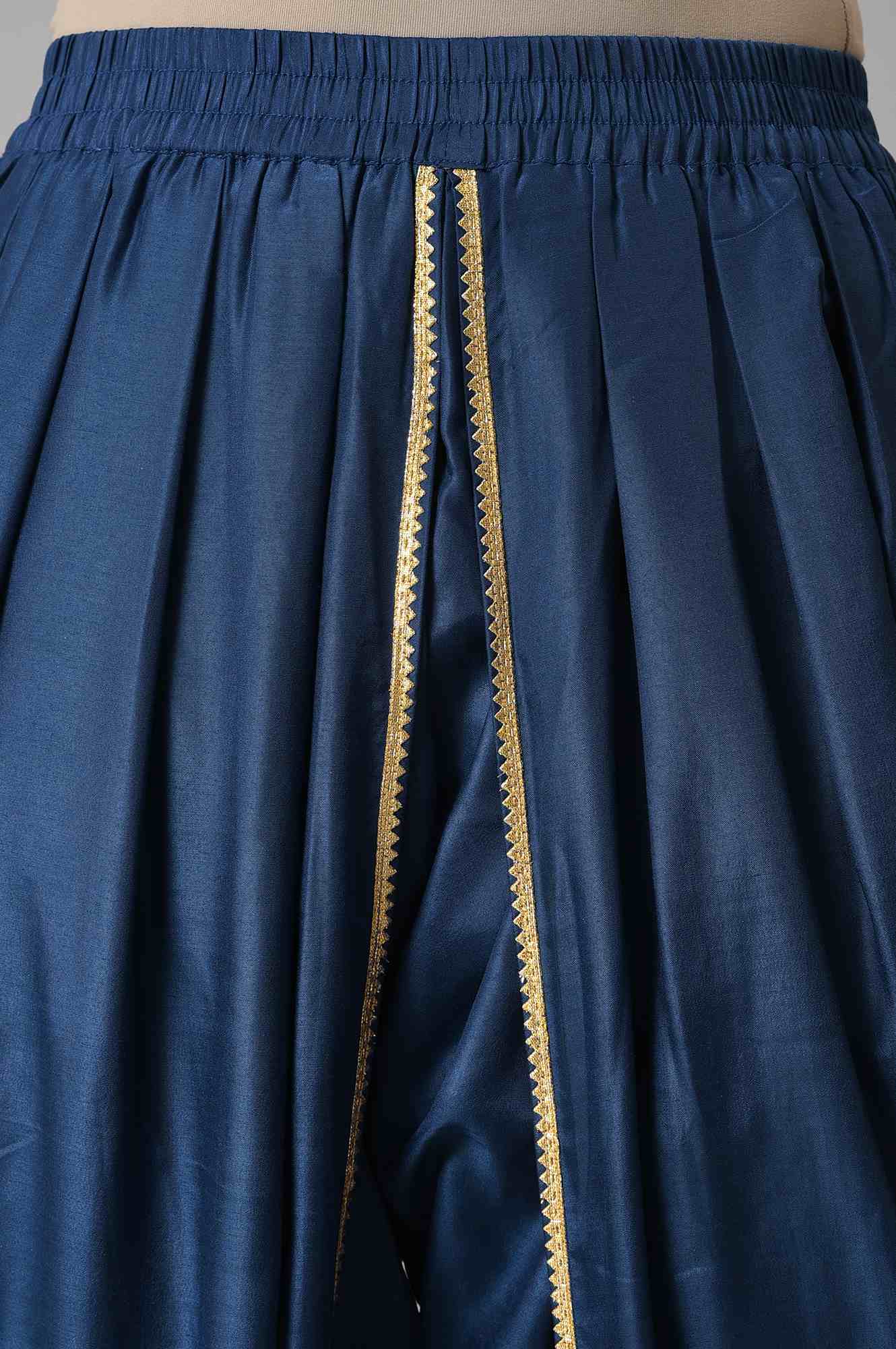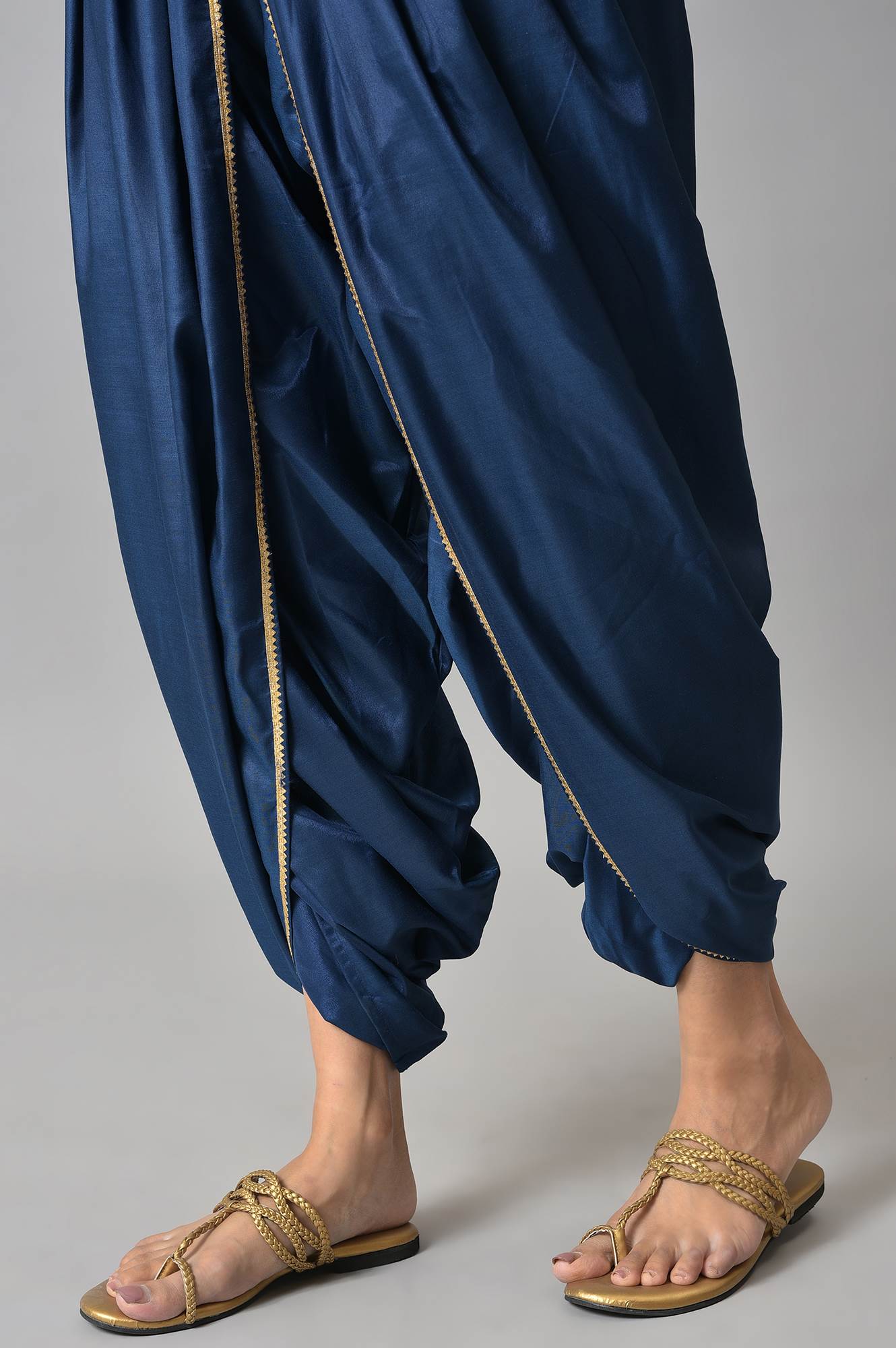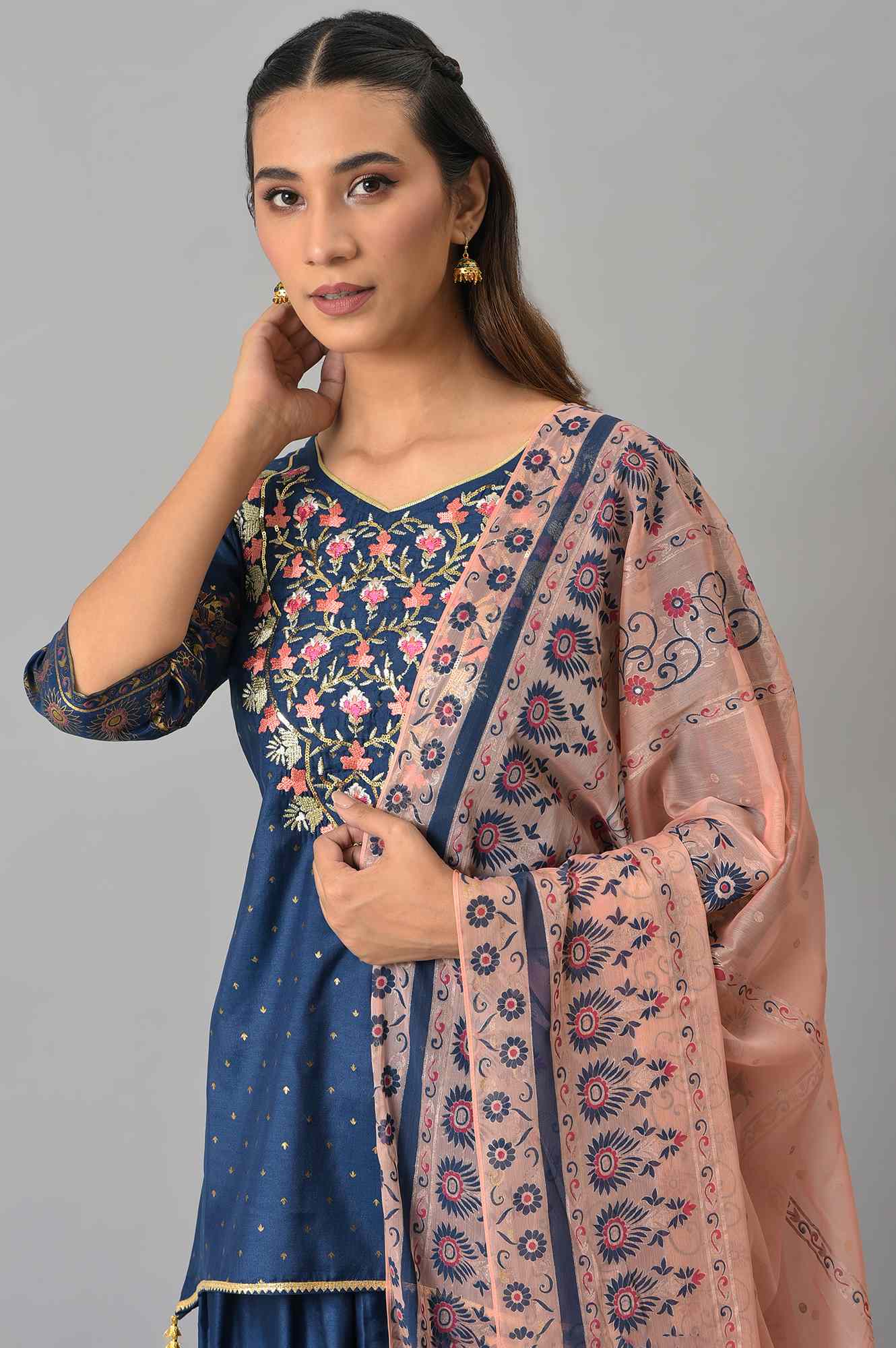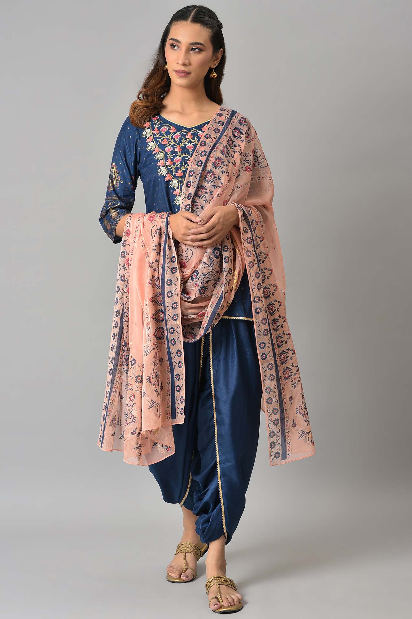 Blue Embroidered Short kurta with Dhoti Pants and Peach Dupatta