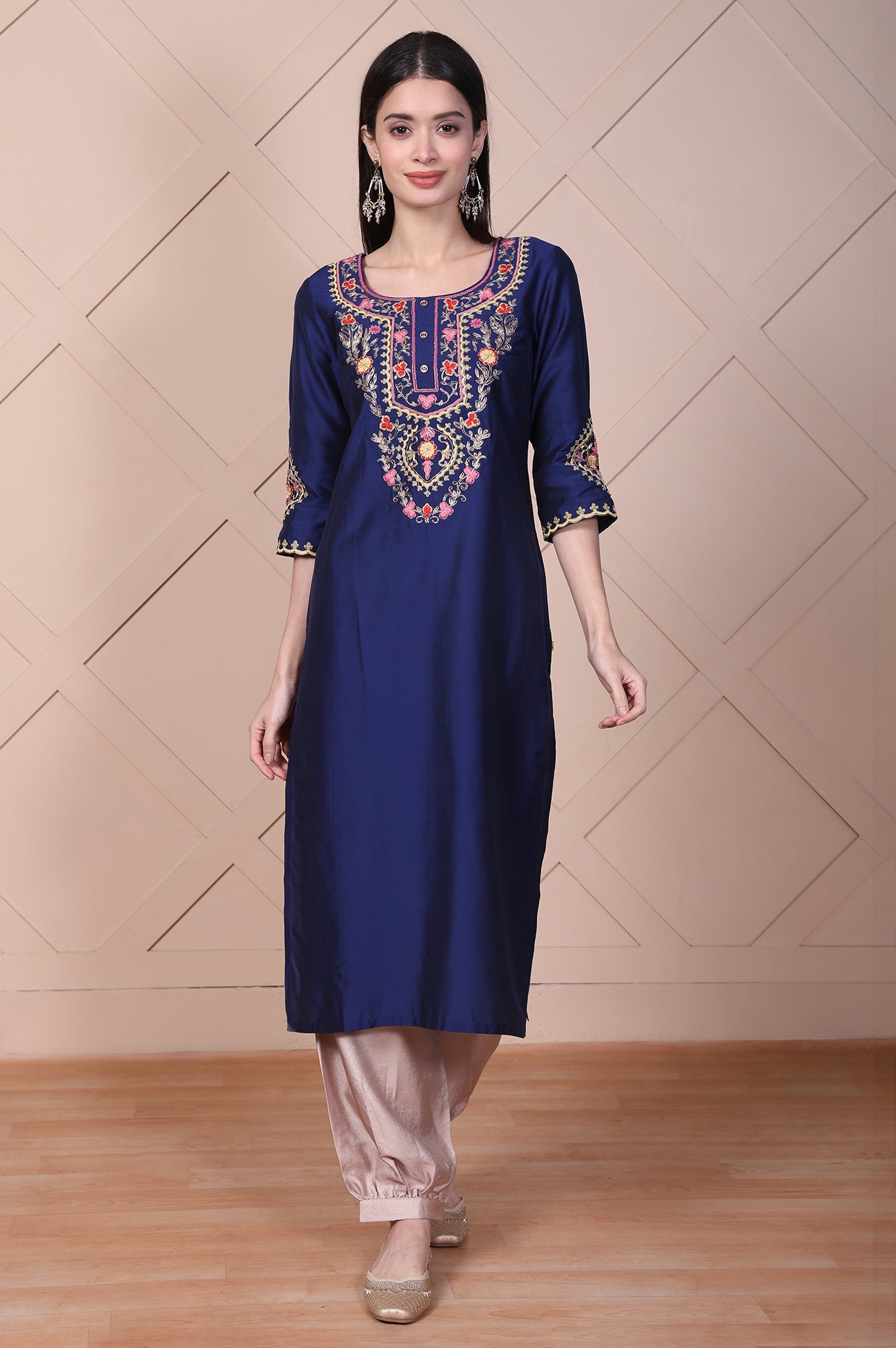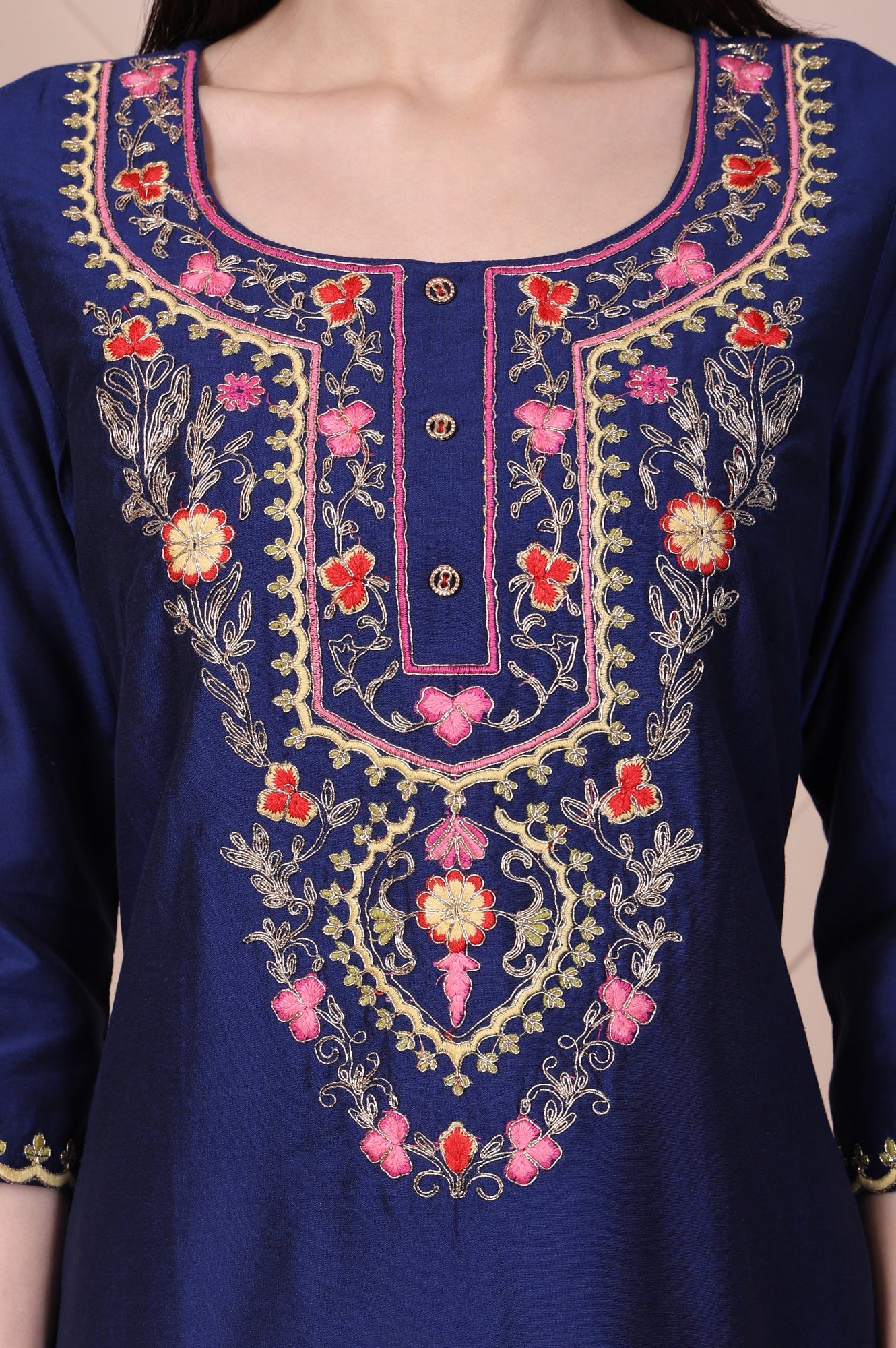 A canvas of deep sapphire artistry, this straight silhouette kurta for women is a testament to timeless grace. This garment flows with an understated elegance, designed for moments that call for a touch of traditional splendor. Its classic round neckline serves as the perfect frame for a magnificent yoke, which is lavishly decorated with intricate, multi-hued floral embroidery that cascades beautifully down the front. This detailed ornamentation is a stunning display of craftsmanship, transforming the tunic into a piece of wearable art. The three-quarter sleeves are thoughtfully designed, culminating in a matching embroidered border that mirrors the yoke's rich beauty, adding a harmonious finish to the design. Crafted for comfort and a flattering fit, this ethnic tunic features a clean straight hemline with side slits, ensuring ease of movement. The fabric is fully opaque, offering complete coverage and confidence. You’ll find this navy blue embroidered kurta to be a wonderfully versatile addition to your festive ethnic wear wardrobe. It’s an essential piece for anyone seeking a blend of classic design and modern appeal, perfect for celebrations and special gatherings where making a sophisticated impression is key. This single-piece kurta is a celebration of exquisite detail.