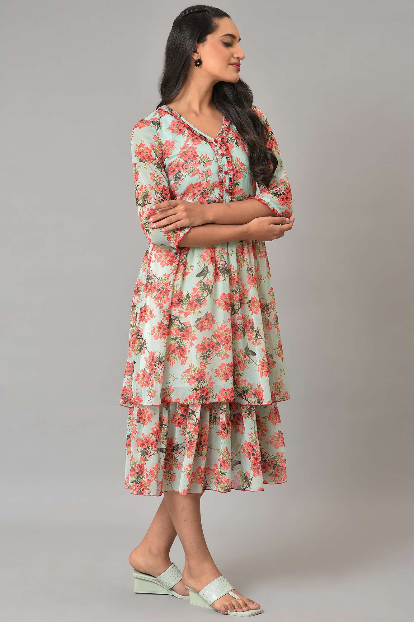 Level Up Your Days With This Bright Chiffon Dress Printed With Contrasting Floral Iterations. It Features Neckline Adorned By Ruffles With Baby Overlock And The Dress Flaunts Tiers That Gives A Breezy And Eye-Catchy Look. Complete This Look With Coordinating Chunky Earrings Depending On The Occasion And Comfy Flat Footwear.