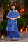 This striking blue chiffon set plays with a bold print-on-print concept, featuring a halter neckline for a contemporary flair. The fluid drape of the ensemble enhances movement, making it an easy statement piece. The kurta is paired with tonal floral printed flared pants and dupatta.