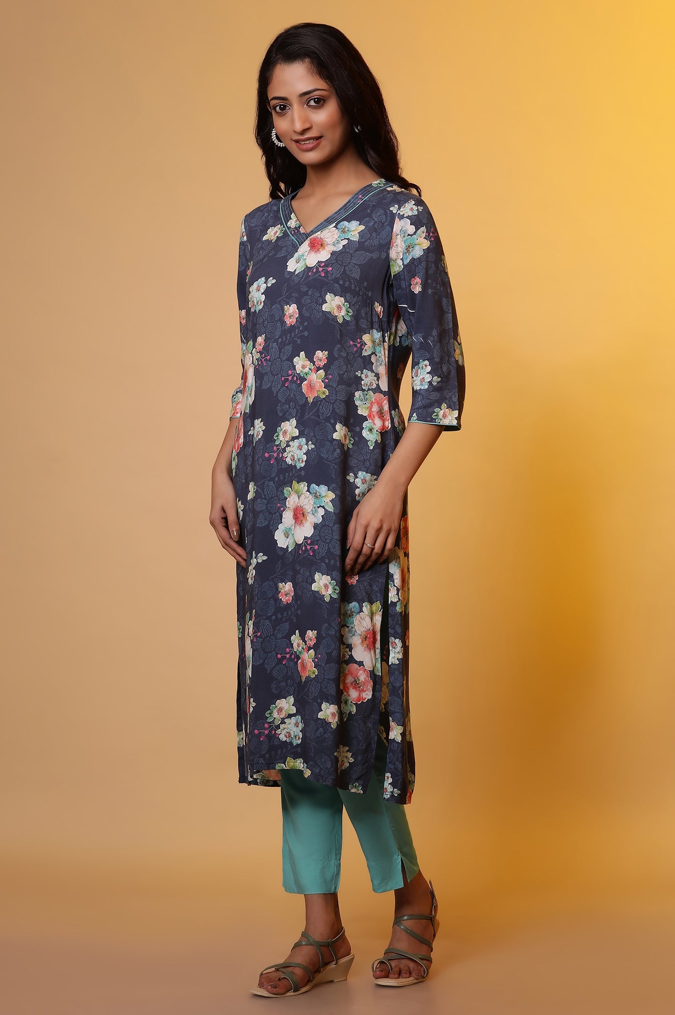 Floral printed straight kurta in fluid soft rayon fabric with neck detail. It has V-neck with minial stitch line detailing and contrasting piping.
