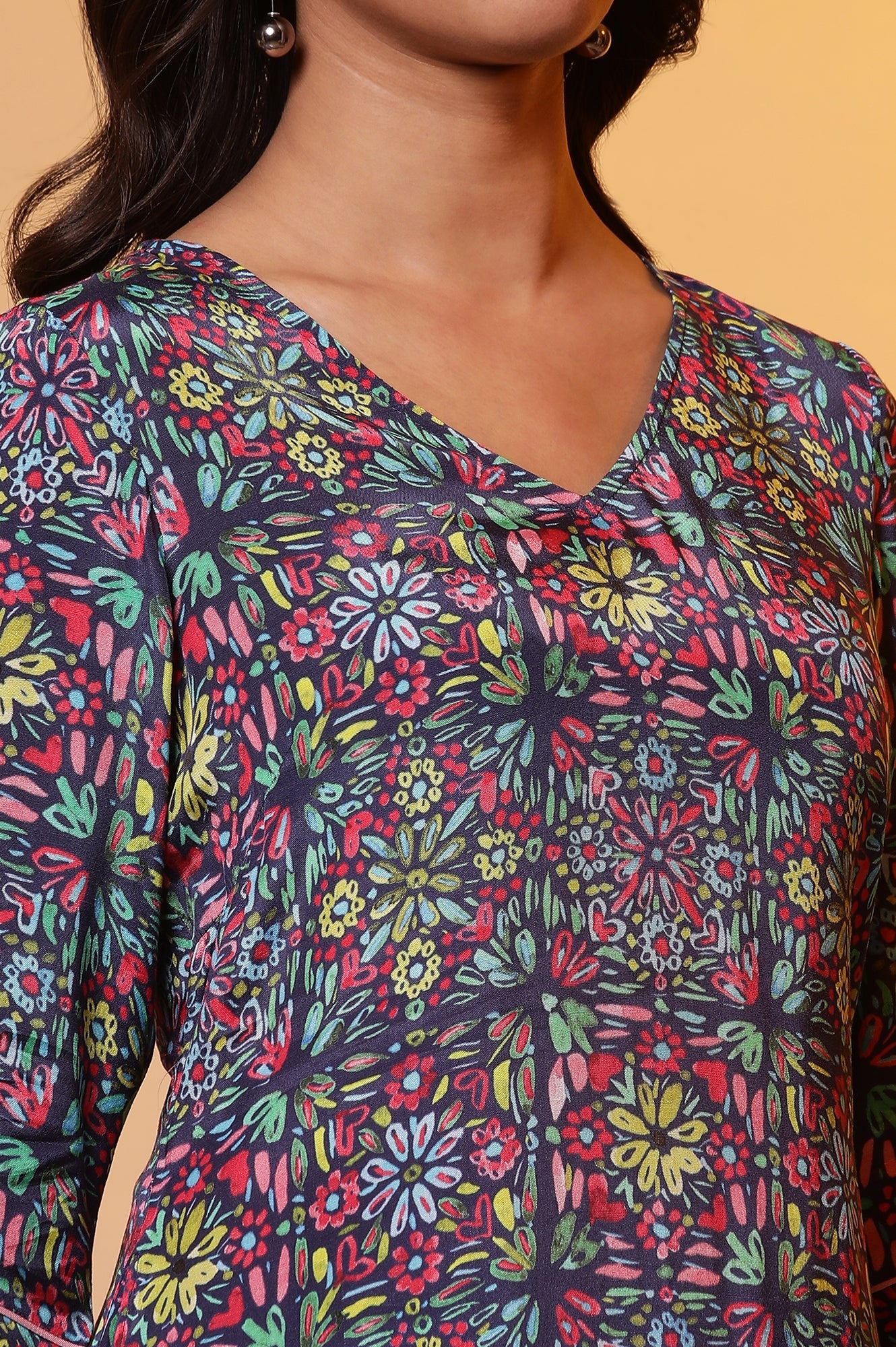 This playful co-ordset in colourful print is an effortless go to, for everyday outing. It's comfortable cut and added pockets makes it an absolute choice. V-neckline and v cut on sleeve's hemline make the piece stylish and classy. The kurta comes with matching pants having elasticated waistband.