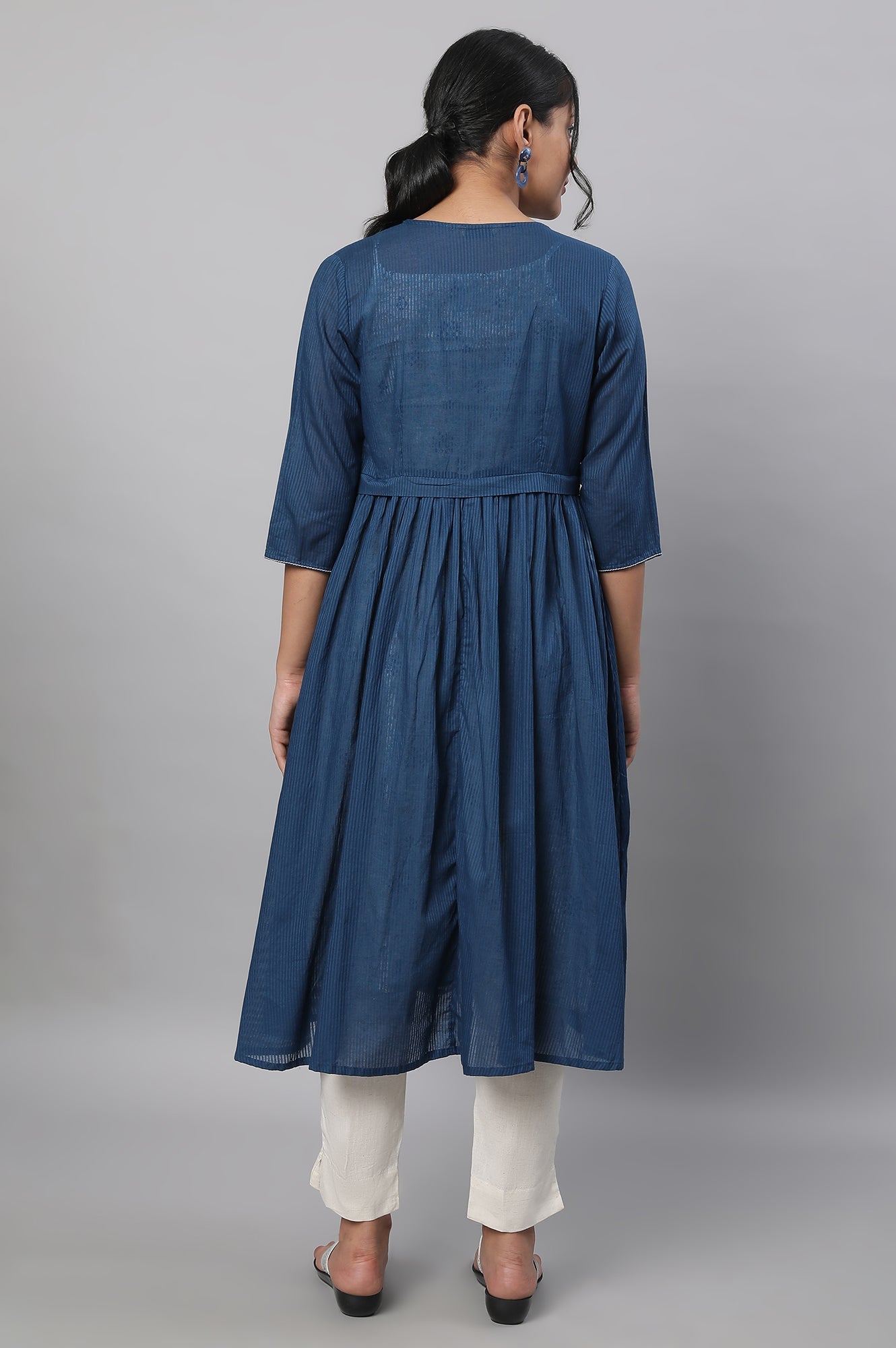 This stylish contemporary set is a must-have for your summer wardrobe. This set includes blue fit and flare Gillet with gathers. The set also includes printed strappy kurta and solid trousers.