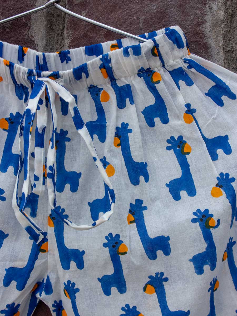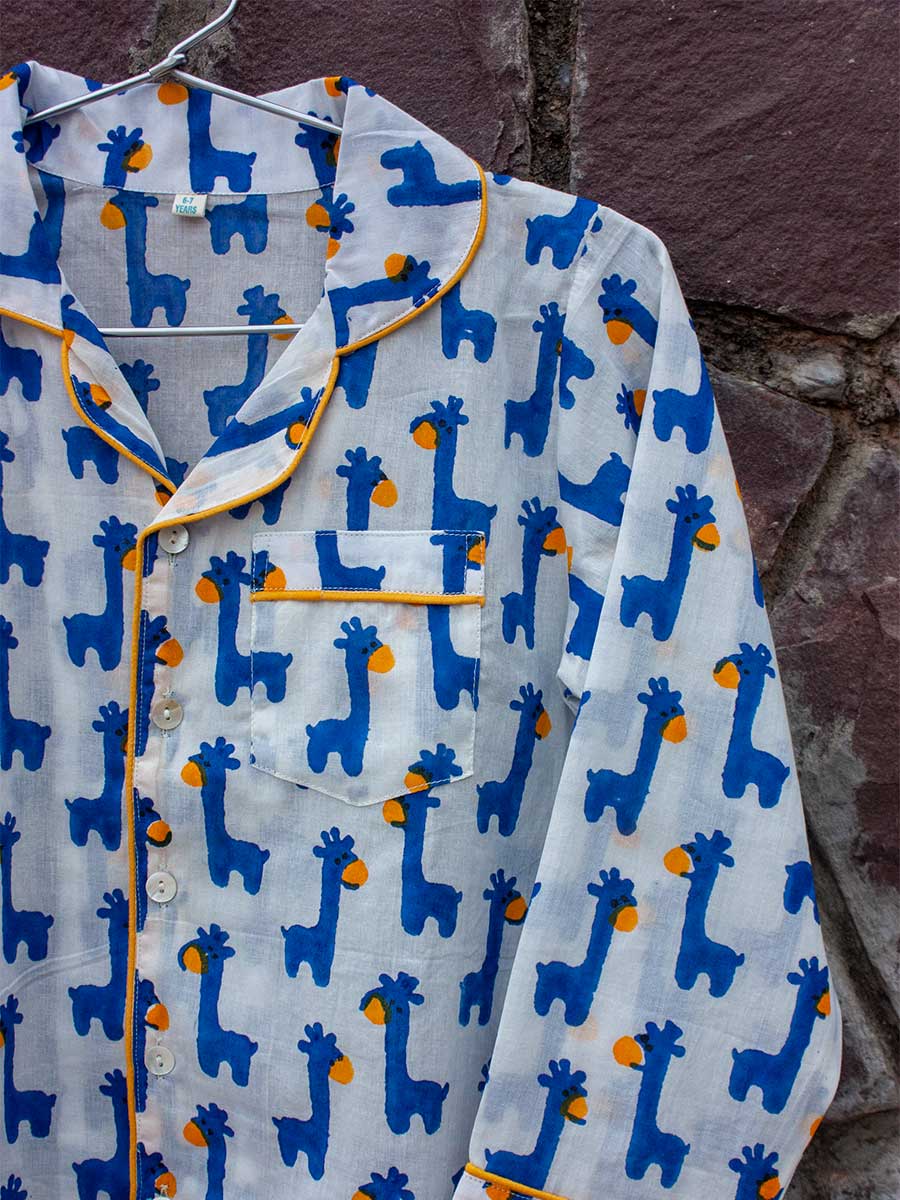 Blue Giraffe Block Printed Cotton Top & Pyjama Set