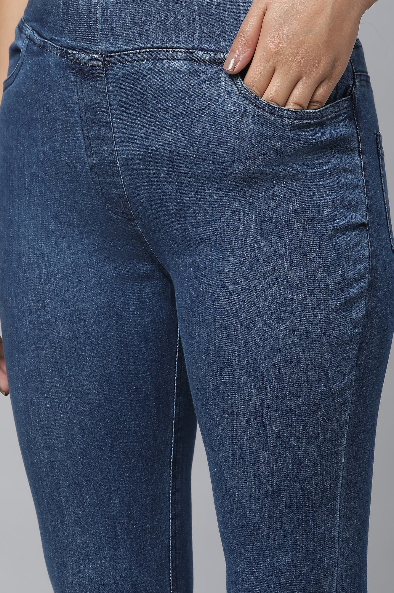 Style Your Casual Day With This Chic Aurelia Set. The Set Has Blue Jacquard kurta In Straight Silhouette And Has Round Neck. It Is Paired With Denim Jeggings.