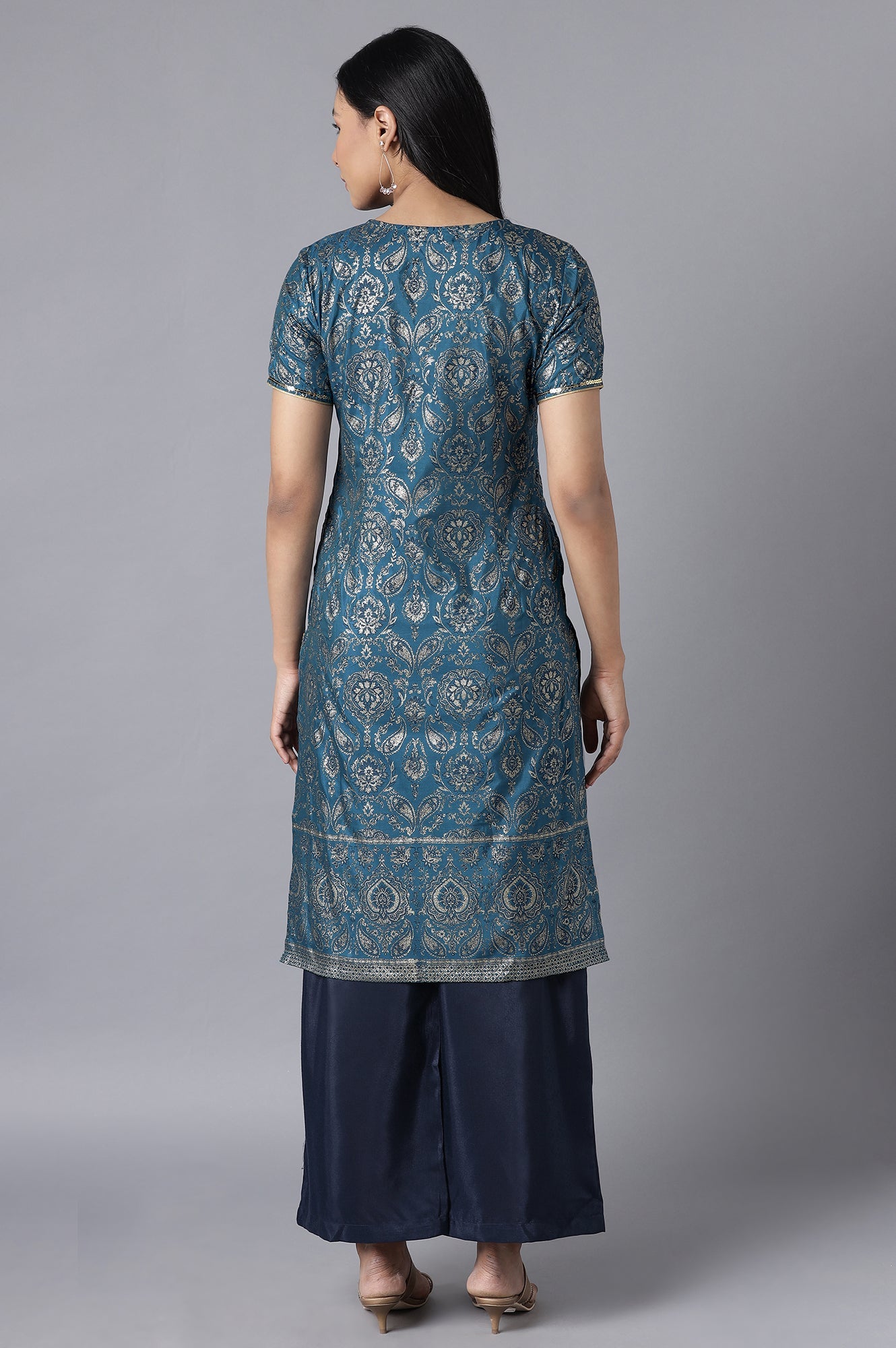 Twilight blue kurta having glittered floral print and sequin detailing. This straight silhouette kurta also features V-neck and short sleeves. It comes with solid blue palazzo in mid-rise and elasticated waistband.