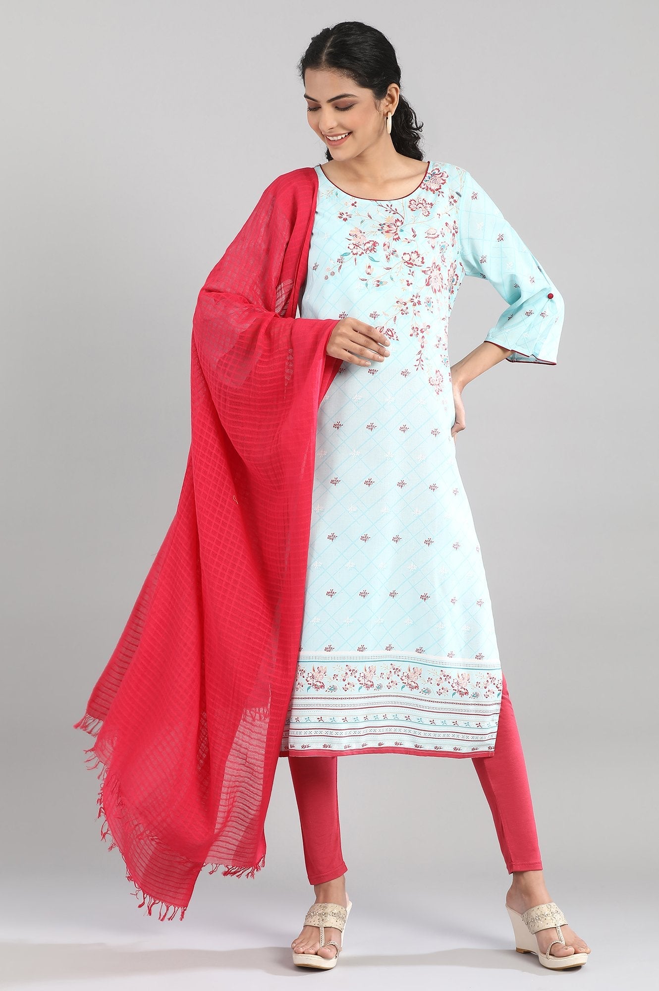 Pagoda blue printed kurta in round neck and three-quarter sleeves.