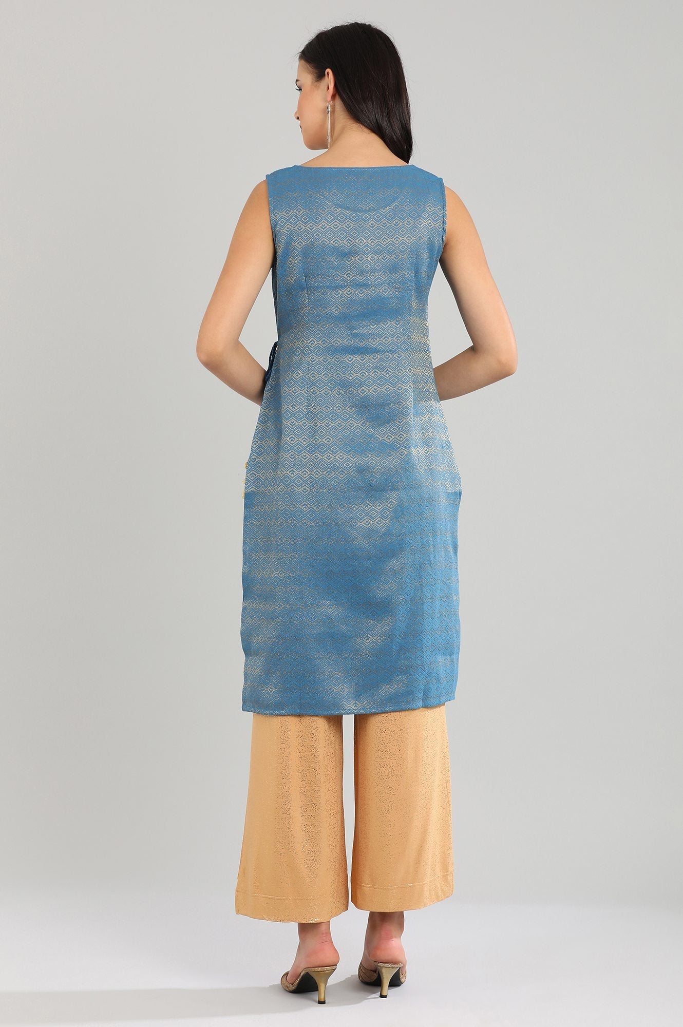 This blue round neck yarn-dyed kurta with golden lace at neckline and tie-up on one side.